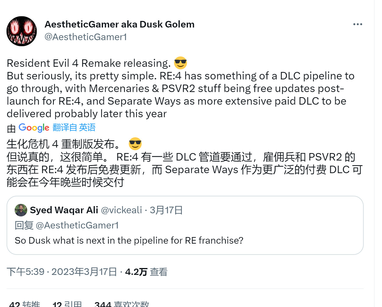 据舅舅党Dusk Golem爆料,《生化危机4:重制版》将有付费DLC“Separate Ways”,该DLC内容更丰富,今年晚些时候推出。 随后在Resetera上,Golem还补充称这是一个完全彻底的DLC,将比原来的“Separate Ways”更长更充实。 “Separate Ways”DLC是《生化危机4》的支线故事,在GameCube版发售后添加到其他平台。在里面玩家操作艾达王,使用手枪,独特的近战攻击和用于进入地图不同地区的钩枪。像村子里的战斗这样的部分有了新的玩法,玩家可以了解更多关于她在故事中的参与。 Capcom尚未正式确认该DLC,不过Capcom曾表示《生化危机4:重制版》发售后将有免费内容:雇佣兵模式和PSVR2更新。 |