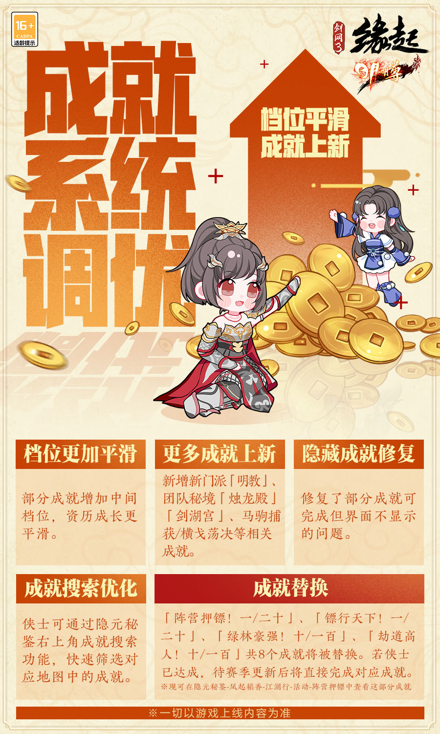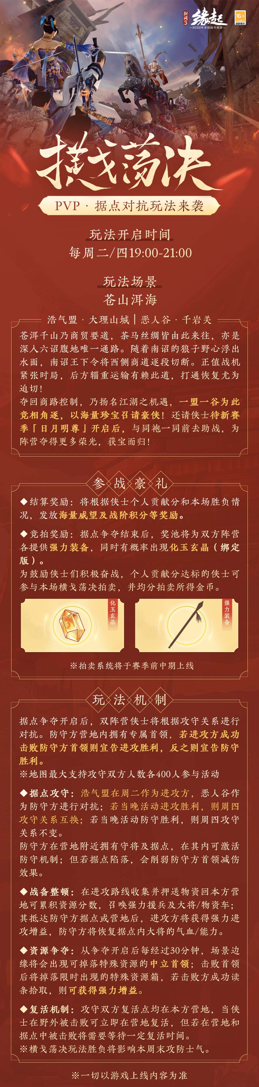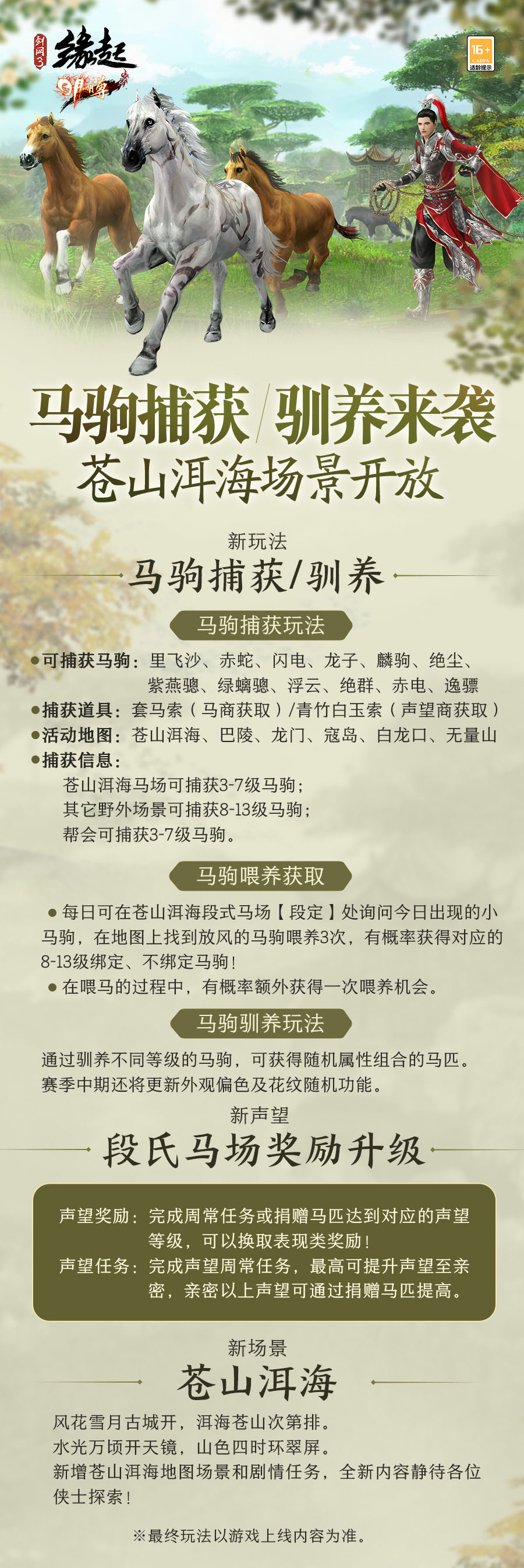 三更夜雨,八方奔袭,闻有战意鸣天明。《剑网3缘起》新赛季“日月明尊”公测定档3月30日,新赛季开始最后倒计时!新门派明教即将现世,体验服火热开测中!竞技场新玩法即将上线,全新1V1模式待侠来战!更有海量新赛季上线玩法内容,马驹捕获、驯养来袭,全新据点战对抗玩法待侠与同胞一同前去助战!详情要闻,请君一览。 【名剑大会烽烟起 竞技模式焕新升级】 好武者酣战淋漓,善谋者弈局纵横。名剑大会新增1V1对局模式,新赛季日月明尊开启后,侠士可前往各大主城战场区【名剑大会报名人】处通过散排匹配参与该玩法,快意对战!【决战?乐山大佛窟】将作为1V1专属对战场景!各门派对战时会禁止使用部分武学招式,绝世神兵和精简五彩石的触发效果在1V1对局模式下不生效。通过对局胜负情况可获得相应名剑币奖励,个人积分将计入“风云录-名剑大会排名-1V1排名”,获得丰厚排行榜奖励! 【马驹捕获驯养来袭 苍山洱海场景开放】 风花雪月古城开,苍山洱海次第排。新赛季日月明尊开启后,新增苍山洱海地图场景和剧情任务,全新内容静待各位侠士探索!同时马驹捕获及驯养玩法上线,千里宝马待侠捕获,更有新段式马场声望奖励和声望任务,更多趣味内容等侠体验! 【横戈荡决角逐起 据点对抗玩法来袭】 刀剑会逢,不战不休。苍山洱海乃商贸要道,夺回商路乃扬名江湖之机遇,一盟一谷为此竞相角逐,以海量珍宝召集豪侠!还请侠士待新赛季日月明尊开启后,与同胞一同前去助战,为阵营夺得更多荣光! 【成就上新档位平滑 成就系统调优升级】 成就系统焕新调优,新赛季日月明尊开启后,新增更多成就,侠士探索江湖的每一步皆有所得!增加成就中间档位,资历成长更平滑;成就搜索优化快速筛选对应地图成就,部分成就替换,成就显示问题同步修复! 《剑网3缘起》“日月明尊”公测进入最后倒计时,海量全新内容即将上线,轻松畅玩!多重福利助力侠士开启新征程,欢迎各位侠士重游故地,回到梦开始的地方,追寻昔日江湖情! |