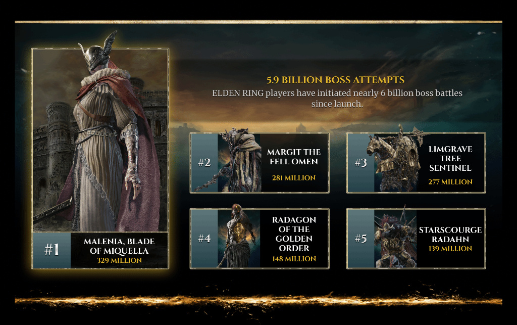 《艾尔登法环》首发至今,现已过去了一年多。游戏的销量在上个月突破两千万,这也使它成为了魂类游戏迄今为止热度最高的作品,且没有之一。 日前,万代南梦宫公布了一系列新数据,但却不是关于收入财报的。而这些动辄以亿为单位的恐怖数字,则都是由玩家们在体验游戏的过程中所创造的。 数据显示,自《艾尔登法环》发售以来交界地到处都是褪色者们的亡魂。“YOU DIED”这两个词足足出现了90亿次。对此,官方还对褪色者的死亡原因进行了细分,69%的击杀是由敌人/Boss直接造成的、15%的人是因负面而死。 但出人意料的是,玩家因跌落而摔死的比例高达14%(12.6亿次)。可仔细想想,跟敌人对战时太过入神,往后翻滚跌落悬崖;没注意路况马失前蹄的情况,在游戏中确实比较常见。另有2%的玩家,是被入侵到世界中的其他玩家所击败的。 此外,官方还统计了《艾尔登法环》中被挑战次数最多的五个Boss。从某种程度上来说,这份榜单也代表着最难挑战的敌人名单。按照排名从高到低,他们分别是:女武神玛莲妮娅(3.29亿次)、恶兆玛尔基特(2.81亿次)、大树守卫(2.77亿次)、拉达冈(1.48亿次)以及拉塔恩(1.39亿次)。 虽然不是最终Boss(很多玩家可能都撑不到这一步),但玛莲妮亚却是游戏中最能劝退玩家的敌人之一。即便她的体型跟拉塔恩完全没法比,可是给予玩家的压迫感却一点儿都不少,米凯拉的锋刃远比大伙想象中更具杀伤力。 值得一提的是,作为《艾尔登法环》知名玩家的“Let me Solo her”,光一个人就贡献了四千次挑战。当前他正在尝试将全地图的敌人,都用Mod替换成玛莲妮亚进行挑战。 数据显示,玩家使用次数前五的法术为:岩石球、奔放结晶、辉石魔砾、巨剑阵、腐败吐息 玩家使用次数前五的祷告为:黄金树恩惠、兽石、黄金树立誓、癫火、野兽活力 由于《艾尔登法环》中的武器、装备众多,打法流派也各异,所以关于这方面的数据并未进行统计。不过上述内容,也算是能代表绝大部分玩家,在游戏中的表现以及偏好性了。 不久前,《艾尔登法环》的DLC“黄金树之影”正式官宣,目前仍处于开发状态中。对于广大玩家而言,这或许代表着新征程的开启。 那么上述所统计的数据,又是否符合大家在游戏中的遭遇呢? |