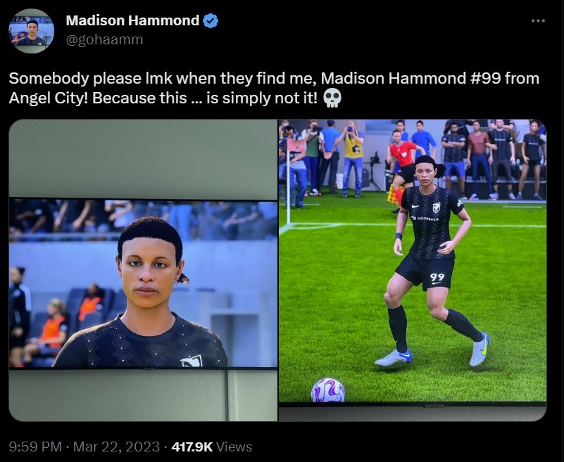 近日《FIFA 23》新更新上线,美国国家女子足球联赛和女子冠军联赛球队加入游戏中。然而对女球员来说,她们在游戏中形象太糟糕,甚至把孩子都吓哭了。 来自美国女足联赛(NWSL)的12支女足球队已加入《FIFA23》,包括波特兰荆棘队的Janine Beckie、天使城的Madison Hammond和Sydney Leroux等球员。这些女球员在网上分享了她们在《FIFA23》中的形象截图,并批评EA的女足建模太糟糕。 球员Madison Hammond写道:“如果有人找到我,请告诉我。麦迪逊·哈蒙德,来自天使城的99号,因为这就不是我”。Janine Beckie笑称:“我找到了失散多年的双胞胎,显然是兄弟。” 而Sydney Leroux则表示:“请告诉我,我并没有做过全身扫描?你们把我孩子都吓哭了。” Sydney Leroux还发布了球员Kailen Sheridan的光头模型截图,看起来又是《FIFA》Bug出现。她说:“我知道EA希望女性能对他们心存感激,但请不要再浪费我们的时间了。我们中的一些人都秃顶了。” |