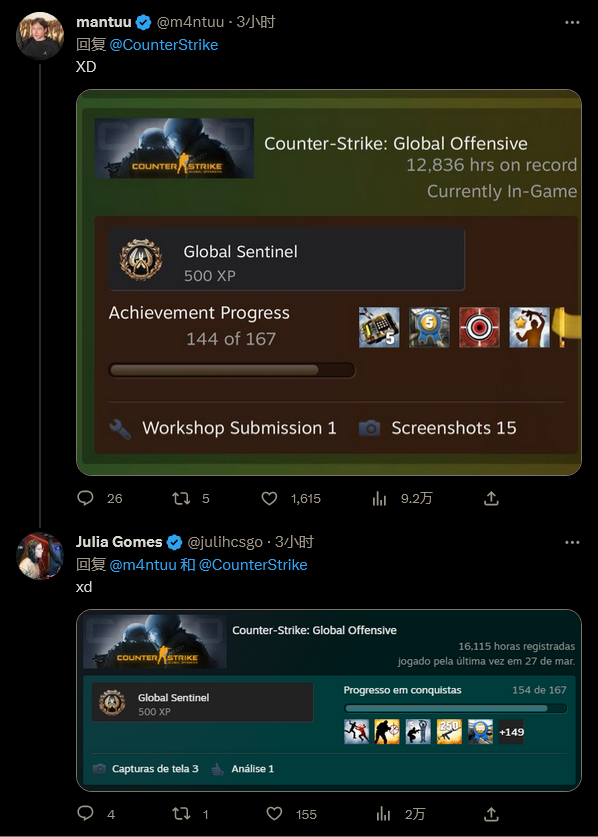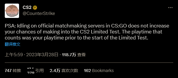 自上周 Valve 官方公布《反恐精英2》后,同时开始的还有游戏的限量测试。但是只有一部分职业选手以及玩家获得了参与限量测试的资格。获得资格的判断标准并没有明确公布,但是许多玩家猜测这和《CS:GO》的游玩时长有关。 这导致许多玩家开始大量的游玩《CS:GO》,其中不乏许多玩家并不想真的“玩”游戏。毕竟,《CS:GO》对这些上万小时的玩家吸引力远不能比得上《CS2》。因此他们选择在游戏的官方匹配服务器中挂机。 今天(3 月 28 日)Valve 官方在推特上称,这么做并不能增加获得限量测试资格的几率。公告推文说道:“在《CS:GO》的官方匹配服务器上挂机不会增加您进入《CS2》限量测试的机会。计算的游戏时间是您在限量测试开始前的游戏时间。” 各个职业队伍纷纷在这条推特下开起了玩笑,不过不能保证是运营账号的人也想玩《CS2》。也有许多玩家纷纷秀出自己上万小时的游戏时长,显然他们并没有获得测试资格。 当然,限量测试肯定不会仅仅计算游戏时长。根据观察,游戏的主播、内容制作者以及职业选手更有可能获得测试资格,有一些在发现一开始并没有获得测试资格,向 Valve 询问后也获得了测试资格。可以猜测这次限量测试也是一种宣传手段。 |