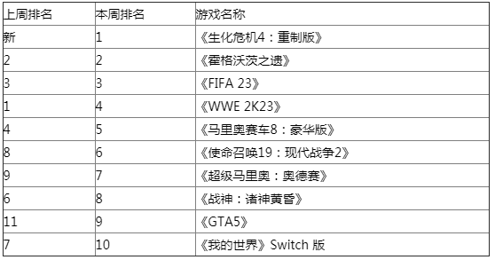 根据全新英国 GfK 游戏实体销量数据(截至 3 月 25 日的一周),《生化危机4:重制版》是《生化危机》系列在该国首发销量排名第 8 的作品,首周销量超过了在 GameCube 上发行的原版游戏。 与 2005 年 3 月再英国推出的原版《生化危机4》相比,重制版销量高出 29%。虽然当时在该地区,游戏仅在 GameCube 一个平台发布,且该主机也不是最受欢迎的平台,但原版游戏销售均为实体,而重制版还有数字版销售额,因此重制版的首发销量只可能更高。 作为上周最受欢迎的游戏,《生化危机4:重制版》实体销量排名榜首。紧随其后的是《霍格沃茨之遗》,这款游戏的销量周同比下降 31%。 排名第 3 位的《FIFA 23》周同比销量上升 11%,排名第 3 位。而上周排名第 1 位的《WWE 2K23》销售额周同比大幅下降 58%,跌至第 4 位。 上周是《使命召唤19:现代战争2》的免费体验和双倍经验周末,因此游戏的销量也被推动上升了 49%,排名第 6。 海外最近还推出了全新的《超级马里奥:奥德赛》的任天堂 Switch 捆绑包,也受此影响,销量上升 16%,排名第 7 位。随着《超级马里奥兄弟大电影》下周上映,游戏应该会继续保持热度。 上周另一款销量暴涨的游戏是《索尼克:未知边境》。这款游戏上周受到大量宣传的影响,销量暴增 217%,游戏重新进入排行榜第 16 位。 排行榜还出现了一款新游戏:《莱莎的炼金工房3:终结之炼金术士与秘密钥匙》。这款 RPG 新作首次登上排行榜第 32 位。 以下为上周GfK 英国实体游戏销量前十: |