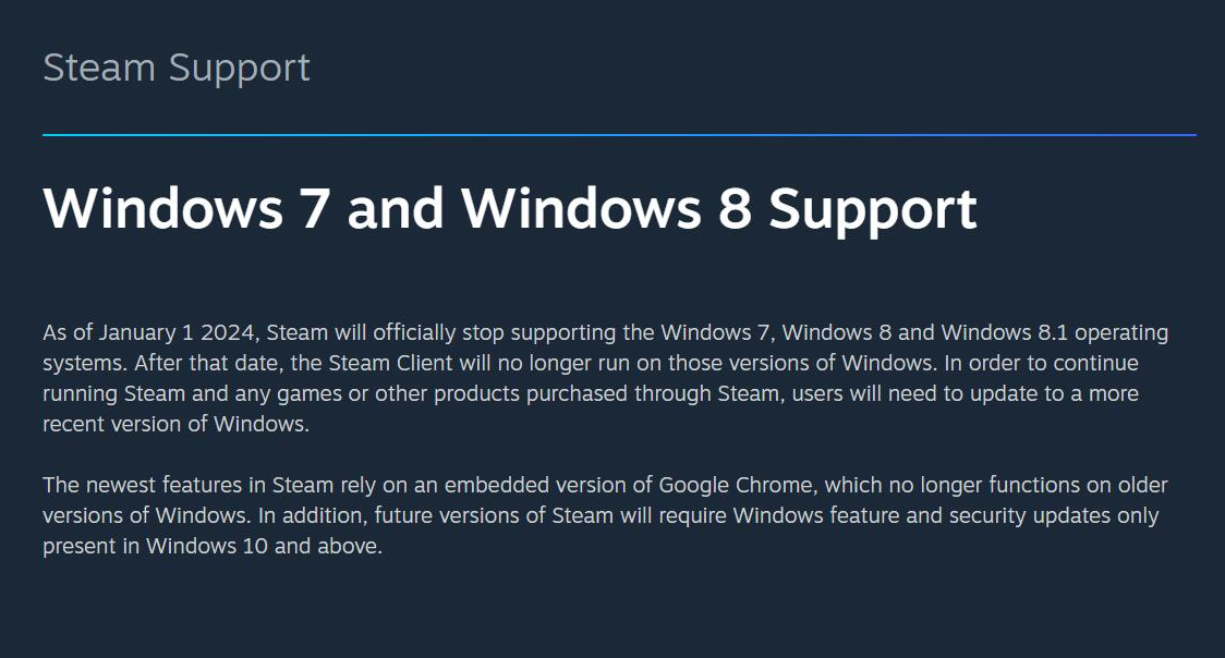 作为当今PC玩家圈子里无人不知、无人不晓的游戏销售平台,Steam的上线时间可能比绝大部分玩家印象中要早得多。发布于2002年的Steam,至今已经走过了21个年头了。 从最初饱受诟病的“V社游戏启动器”,到成为现在这般,在游戏圈内拥有举足轻重的地位,Steam的成功离不开一直以来的创新与进步。而在近日,Steam平台又给玩家们带来了一个重磅消息——从2024年开始,Steam客户端将不再支持Windows 7/8/8.1系统。 Steam在官方公告中明确提到:从2024年1月1日开始,将正式终止对Windows 7/8/8.1 系统的技术支持,之后操作这三类系统的玩家将无法登录Steam及使用上面的任何产品,用户必须升级到新版本的Windows。 V社发布的这个公告,其实完全可以理解。毕竟随着时代的进步,技术水平的不断提升。如今的游戏作品对系统配置的要求,也随之变得水涨船高。Windows 7和Windows 8分别发布于2009年和2012年,那时候的游戏跟现在相比,可以说已经出现了明显的代差。 即便是历经PS3、PS4、PS5三个世代,近期还登陆了PC端的《最后生还者》,也只是2013年的作品。Windows 7和Windows 8这样的“经典操作系统”,在如今这个时代属实有些过时了。 当然,Steam在这时候选择淘汰老的操作系统,也是对实际情况进行过考量的。在2023年Steam的硬件和软件调查数据中,明确统计出了包括Windows 7、Windows 8、Windows 8.1在内的这三类系统的用户占有率,最终得出了合计不足2%的结论。 如今的PC玩家群体中,Windows 11、Windows 10才是主流。Windows 11的占有率为33.27%,而且呈上升趋势;Windows 10的份额则达到了64.68%。在本次更新之后,玩家要想使用Steam,最低门槛就是Windows 10,这算是V社给了玩家们一个不得不升级新系统的理由。 当然,Steam的这次改变对于大伙单位里那些上了年头的老电脑,可能会造成比较大的影响。网友们第一时间想到的,就是摸鱼刷Steam找游戏的操作,从明年开始就用不了了。 但对于“现在的Win7不适合玩游戏”的论调,玩家们也大可不必太挂怀。毕竟在Steam宣布将不再支持Windows 7系统以前,微软在2015年就结束了对Windows 7的主流支持;2020年结束外延支持;到2023年1月10日还彻底结束了付费外延扩展支持。 相较于显卡等硬件设备的迭代,操作系统这样的软件设备的发展速度已经算慢的了。或许在部分玩家的记忆中对Windows 7还有所惦念,但也是时候该“断舍离”了。 那么大家现在正在使用的设备,到2024年还能支持Steam客户端吗? |