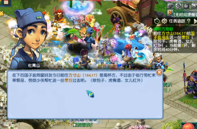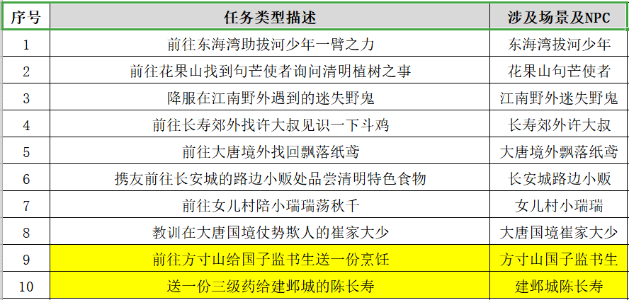 2023年清明节活动将于2023年4月4日12:00-4月10日12:00全天开启,现在正在部分服务器测试。下面,就给大家介绍下环式任务——清明万物新攻略! 在任务时间内,玩家需要组队前往长安城(228,119)处,找到杜青山领取任务。值得注意的是,每天的前100环为双倍奖励,101至140环为1.4倍奖励,141环后无奖励。 任务类型,一共有10种。其中,前8种任务类型都需要战斗。虽然大部分任务类型都需要战斗,但是有一点值得开心,那就是战斗中并没有任何特殊怪物! 怪物数量最多为10个,最少只有1个!虽然有3种任务类型的怪物数量较少,但是它们并不会召唤和分身!这点还是非常不错的。 值得注意的是,花果山的句芒使者这场战斗,主怪不会被攻击!当其余小怪全部被击杀之后,主怪小树苗会变成参天大树并逃跑。 需要的烹饪和三药,没有品质、种类的要求。只要不是包子、虎骨酒、女儿红、金创药就OK。因此,玩家可以多携带一些在身上。这样不仅可以以备不时之需,最主要的是可以提升效率。 队长玩家,每次成功带队完成一轮任务之后,就触发1次转盘奖励。注意,本转盘只有1个经验丹! 109级队长玩家,当前分辨率为800*600的情况下,可以获得经验、金钱奖励如图所示。除此之外,每完成1环任务,都会获得1点清明节积分。清明节积分,可以兑换召唤兽寿命。 当然了,具体奖励以全服放出后为准。 |