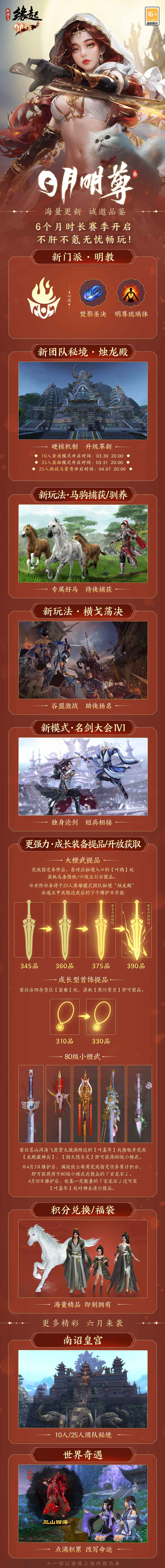 光明齐于日月,与日月而比容。《剑网3缘起》全新年度资料片“日月明尊”今日震撼公测,新门派明教携多种焕新玩法今日正式报到,开启时长六个月的新赛季!广阔大漠地区与精彩玩法正式开放,“烛龙殿”抢先开战,新增名剑大会1V1模式、PVP据点对抗玩法、马驹捕获驯养玩法,6月全新团队秘境“南诏皇宫”和世界奇遇即将开启!更有全新金发、奢华包身披风礼盒、累积冲销奖励今日上新,可交互粒子特效背挂【青莲雨瀑】来袭,海量好礼正放送千万别错过,快来携友畅游江湖! 【日月明尊震撼开启 玩法调优全新体验】 双心法新门派明教震撼现世,新团队秘境“烛龙殿”待侠挑战,5人秘境“光明顶密道”登场!坐骑驯养玩法来袭,全新PVP据点对抗玩法,新增名剑大会1V1模式,热血对抗待侠一战!6月更有全新团队秘境“南诏皇宫”和世界奇遇来袭,带给诸位侠士更多挑战乐趣!游戏内容亦迎来进一步优化:大橙武和成长型首饰提升品质,积分兑换海量精品,更有全民可得80级小橙武,满足不同侠士的畅玩需求! 【公测来袭诚意献礼 九重献礼助力成名】 九重活动,公测献礼!参与游戏内各种玩法、每日签到,得海量数值、披风【凰尾白绫】、跟宠【夏夏】、精美腰挂【垂烟萝】、精美背挂【熹焰】等奖励,更有全民可得小橙武等你来领,诚意十足,福利满满!现将活动内容整理如下,请君一览。 【赛季更新再添佳品 海量精美外观来袭】 《剑网3缘起》日月明尊震撼公测,海量精美外观来袭,全新金发飞灵携奢华包身披风礼盒、小白龙主题礼盒上架,月度限定外观和精美成衣上新,全新特效踏影神骏等待君一览,更有200%积分回馈侠士! 商城新品快看视频抢先一览! 奢华包身礼盒「日月无心」 寒沙孤天红尘远,日月参辰本无心。奢华包身披风礼盒日月无心上架商城,礼盒内含套装披风1件、套装肩饰1对以及套装外装1件,售价88,800通宝。不绑定款将于3月30日20:05限量上架商城500个,绑定款将于3月30日20:20-4月27日7:00限时上架商城。 本次披风礼盒以薄纱轻罗等上好衣料织造出华贵而又独具风情的视觉享受。仿佛火焰般肆意燃烧的金色纹路,神秘而魅惑的红、蓝宝石,精巧而细致的日、月、星点缀,整套外装仿佛如夜空中的明珠,充满着神秘而又夺目的光芒。礼盒内单品不仅在单独展示时效果不俗,同时装备四件套后,还可切换特殊披风包身造型;轻纱连叠曼妙影,日月同辉照无心。 小白龙主题礼盒「玄影腾蛟」 腾蛟起风影,紫电青霜现。小白龙主题外观礼盒上架商城,礼盒内含动作特效外装【玄影腾蛟】1件、主题定制白发1款【玄影腾蛟·白发】、特效背部挂件【抛玉燕】、随礼盒额外附赠主题绑定版定制黑发【玄影腾蛟·黑发】1款,售价52,000通宝。不绑定款将于3月30日20:10限量上架商城800个,绑定款将于3月30日20:20-4月27日7:00限时上架商城。 月光金绸缎面料,表面采用精铸银鳞甲片,袖间衣摆可见飞腾蛟龙。使用外观特效后,将持一柄长杆银枪,舞一段精湛枪术!礼盒交互背挂“抛玉燕”可施展单人或双人踢毽,与友人嬉戏玩耍。高低左右抛玉燕,莺啼笑语脚尖花。 全新飒爽金发「飞灵」 皓月琉辉,英气不凡。全新金发飞灵上架商城,售价28,000通宝。不绑定款将于3月30日20:15限量上架商城800份,绑定款将于3月30日20:20-4月27日7:00限时上架商城。 高马尾的发型干练洒脱,返璞归真,男、女款式搭配黑、白配色打造的精致发饰,清爽的刘海再修饰脸型的同时,更展现层次感,发型整体干净利落,衬托脸部轮廓更显俊朗帅气,举手投足展现潇洒快意的侠客风范! 月度限定外装「自在多罗」 意气风发,飒然出众。月度限定外装自在多罗3月30日7:00-4月27日7:00限时上架商城,共2款偏色可选,购买绑定,售价20,000通宝。配套黑发同步上架,售价10,000通宝。 设计潇洒不羁,重现吐蕃异域风情,服饰款型将凸显侠客风范体现得淋漓尽致,搭配流火金纹刺绣,更具豪情万丈! 精美成衣「熠笼烟薄」 清光玲珑,金箔缀纱。精美成衣熠笼烟薄3月30日7:00永久上架商城,共4款偏色可选,购买绑定,售价20,000通宝,享首周9折优惠。配套绑定黑发同步上架,售价10,000通宝,享首周9折优惠。 外观在布料和裁剪工艺上大幅革新,匠心独运的采用了大面积的轻纱材质,透明纱衣质感轻盈,白色与墨色的搭配烘托出卓尔不凡的书生意气。 特效踏影神骏「青海骢」 轻盈逐风,烨然无双。金羁相驰逐,联翩何穷已,特效踏影神骏3月30日永久上架商城,三种可选,购买绑定,售价68,800通宝。3月30日7:00-4月6日7:00限时7折特惠,折扣价48,160通宝。 雪白鬃毛典雅清矜,气质如画。迎风嘶叫气势磅礴,尽显气概。骏马奔跃如飞星流火踏云而来。 温情回馈,充消有礼。 3月30日7:00-4月27日7:00,累计充值并消耗60元/120元/240元,可分别领取雅致腰挂【几多哀】、背挂【梦鹏】、可交互粒子特效背挂【青莲雨瀑】!活动期间,侠士在全区服消耗通宝购买绑定商品或购买并实装不绑定商品时,立享有200%积分回馈! 【直播活动开启 缤纷佳礼倾赠】 喜迎新赛季,参与直播活动领好礼!新赛季“日月明尊”火热公测,斗鱼直播活动今日同步开启!3月30日-4月13日,侠士可前往斗鱼剑网3缘起分区参与活动,即有机会获得海量好礼!活动期间分区更有各种新版本内容供诸位侠士一饱眼福! 《剑网3缘起》新赛季“日月明尊”3月30日震撼公测,免费畅玩!全新秘境全新玩法全面来袭,九重福利助力侠士开