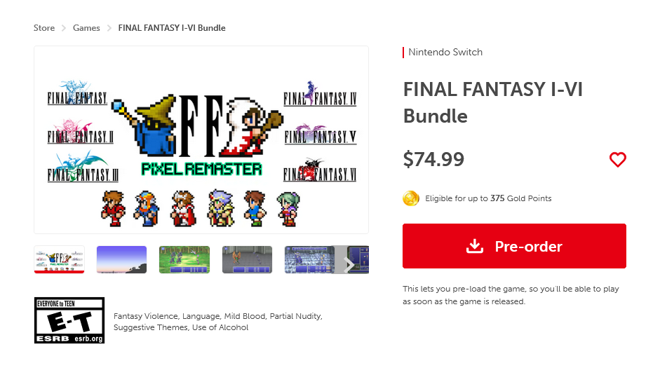 《最终幻想》1 和 2 售价 11.99 美元,3、4、5、6 售价 17.99 美元。所有游戏的重制版捆绑包售价为 74.99 美元。