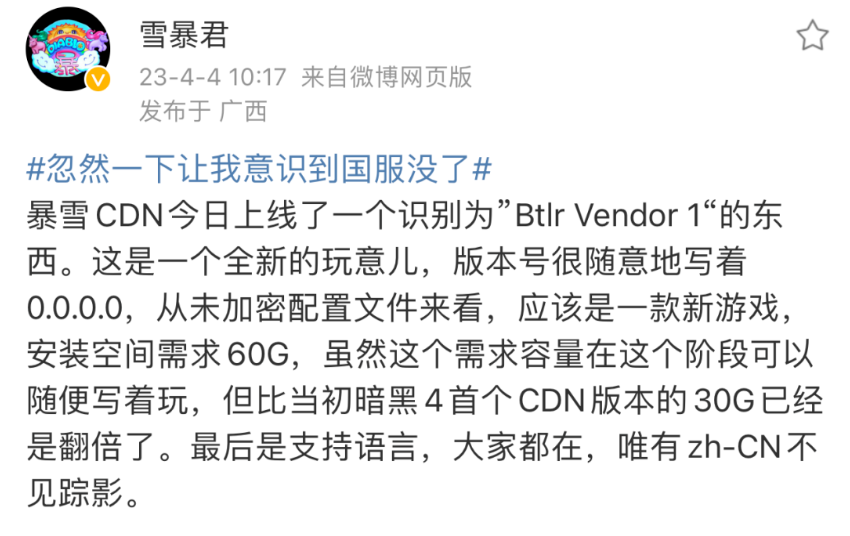 尽管我们都知道暴雪CEO迈克·伊巴拉,对于上线新项目《奥德赛》这件事一直都挺心急的,但没想到的是,这项目急到了暴雪的CDN服务器都提前部署上了一个叫“Btlr Vendor 1”的东西,已经在琢磨给《奥德赛》上战网的事情了。 根据外服数据大神挖掘出来的更新信息来看,现在暴雪CDN服务器内部已经上线了一个叫Btlr Vendor 1的文件,版本号为0.0.0.0,安装预留空间为60G。根据暴雪一贯的习惯来看,这已经是摆明了在给新游《奥德赛》腾位置了,但让人无语的在这个游戏的语言与服务器支持选项中,我们无法找到zh-CN的踪迹,也就是说暴雪没有考虑要在国服同步上线,与实装简体中文这件事。 与此同时,暴雪也火急火燎地公布了魔兽10.1新版本将会在5月2日全球上线的事情,除了有新团队副本、新地图之外,还有上线一项震撼人心的新技能,即跨阵营公会。联盟,部落玩家可以自由选择不同阵营的公会加入。在加入跨阵营公会之后,联盟部落玩家就可以在公会频道自由聊天,也可以自由组队下本。而这一项激动人心的改动,也不会同步到国服,毕竟现在还没有公司来接手暴雪国服的新代理。 结合这两件事来看,我们不得不承认,暴雪在推进新项目与老游戏的新版本更新时,已经把国服玩家给排除在外,暴雪国服目前仅存在于暴白的幻想之中。顺带一提,在去年还没爆出代理危机之前,暴雪在CDN上线暗黑4的时候,就没有zh-CN踪迹,所以这个《奥德赛》不加zh-CN的缘故也可能是因为国服的版号申请难度实在太高了。 不知道面对现在的窘境,大家是会选择等国服上线,还是会选择去外服玩抢先版本呢? |