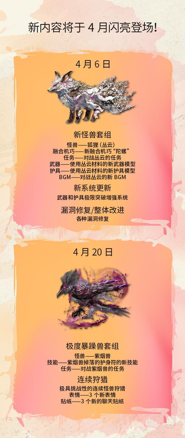 此外,4月20日还将迎来一波更新,其中包括新化兽“紫烟兽”,“紫烟兽”掉落的护身符新技能及新任务等,敬请期待。