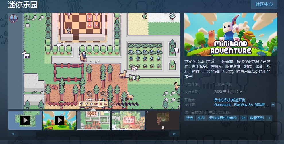 独立模拟游戏《迷你乐园》的正式版将于今日(4月10日)18:00正式上架Steam,售价46元,支持中文,感兴趣的玩家可以关注一波。 《迷你乐园:序章》自开放下载以来得到了华语圈社交媒体的大力推荐和肯定,其拥有的独特趣味魅力的好评也在中文社交媒体逐渐发酵!《迷你乐园》作为一款开放世界生存游戏为游戏空间提供了无数可能性,玩家在游戏的同时充满着对自己成果的期待,华语玩家的热情同样在心愿单上得到了有力的证明。 世界不会自己生成——你去做,按照你的意愿塑造世界!白手起家,在探索、收集资源、制作、建造、战斗、耕作……等的同时为地精和你自己建造梦想中的房子!在《迷你乐园》中您可以在其中做任何想做的事!当然你还是需要时常吃点东西,但除此之外,没有任何限制!你从一小块土地开始,随着时间的推移,你可以用你每天收到的生物群系瓷砖自行扩展。很快,你就会发现自己置身于一座又大又漂亮的房子里,此外还有一个农场,制作新工具并探索洞穴。 游戏特色: 开创世界 每天你都会收到一堆生物群系图块,你可以将其放置在任何你想要的地方!游戏中有多个生物群系,包括:不同的森林、沙漠、草原、雪地、稀树草原、高原等等! 收集资源和制作 你可以通过砍伐树木、开采金属、掠夺怪物以及制作更多物品来收集大量资源! 采矿和制作新工具 登上地下探索黑暗的洞穴并开采珍贵的材料!更好的材料带来更好的工具:斧头、镐、剑、弹弓、画笔等等! 建造和装饰 使用不同类型的木材来制作地板、墙壁、栅栏和各种装饰品,你可以建造你梦想中的房子和周围环境。 农业 你种过西兰花、芦笋或萝卜吗?也许你在饲养羊驼、鸵鸟或追逐浣熊?不管你有没有 与怪物战斗 黑暗带来了怪物。你能与他们战斗,还是只为你的生命而战? 与地精交易 你会在世界各地找到手无寸铁的妖精,你会为他们建造房屋以使用独特的物品进行有利可图的交易吗? |