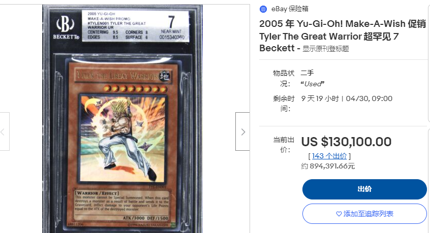 集换式卡牌越来越受收藏界追捧,近日一张世界仅发行一张超珍贵《游戏王》卡牌拍卖,名为“伟大的战士泰勒”,截止本文发稿,现价已超13万美元。