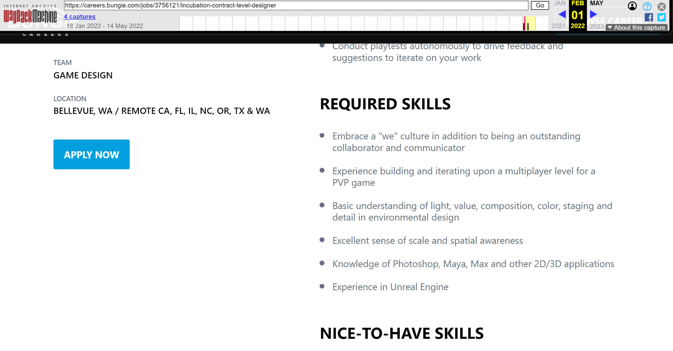 Bungie的《命运》系列一直采用工作室内部引擎Tiger打造,不过看起来Bungie可能准备好将其中一个新作的开发管线转移到一个新引擎中。 据The Game Post报道,Bungie一个未公布多人动作游戏发布的多个招聘广告暗示,该作可能采用虚幻引擎。关卡设计师和环境美工职位的“要求”一栏中都提到了“有虚幻引擎经验”。 目前尚不清楚这些招聘广告针对的是Bungie的哪一个游戏,因为该公司正在开发多个未公布的游戏。此前的招聘广告也提到了一个新的多人动作游戏IP,采用第三人称视角,并有“轻松愉快和古怪的角色”。根据Bungie 2018年提交的商标,可能叫《Matter》,也就是和国内厂商网易合作的游戏。 除了《Matter》外,Bungie还在复活《Marathon》PvPvE射击游戏,其他招聘广告也提到了一个设定在《命运》宇宙的竞技多人新作。 2019年Bungie CEO Pete Parsons表示他们计划在2025年之前发售一个非《命运》IP。虽然该工作室现在已被索尼收购,但未来的游戏会继续是多平台。 |