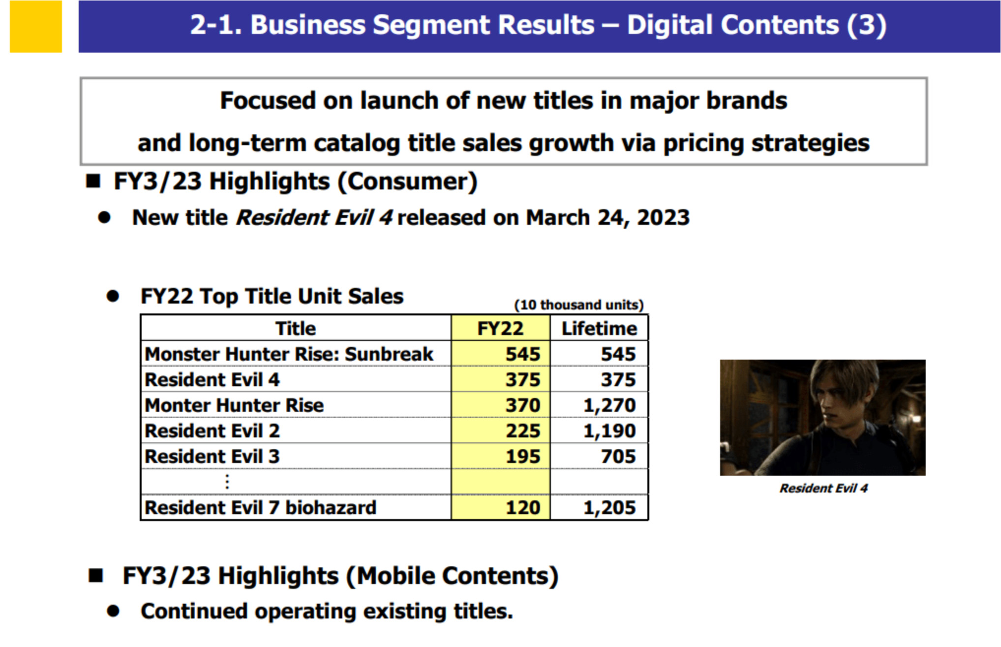 周三发布的年末财报会议上(截止到2023年3月31日),Capcom宣布过去这12个月共售出了4170万套游戏,其中旧游戏2930万,新游戏1240万,是公司有史以来售出游戏最多的一个财年。 Capcom上个财年共售出3260万套,相比来说,Capcom 22-23财年的4170万套有着很大的飞跃,创造了新的历史记录。 随着销量的增加,Capcom表示游戏销售帮助公司连续6年取得创纪录的利润表现,以及连续十年营业收入增长。 Capcom游戏销量的创纪录表现,部分原因在于2023财年发售了两个旗舰新作:《生化危机4:重制版》(在财年结束前一个星期发售)以及《怪物猎人崛起:曙光》,分别售出了375万套和545万套。 然而Capcom售出的游戏大部分仍然是老游戏,主要来自于《怪物猎人》系列,《生化危机》和《鬼泣》系列,达到了2930万套,超过了上个财年的2400万套。 Capcom称22-23财年售出了1240万套新游戏,22-23财年推出了35款“新版”游戏,这包括《洛克人EXE合集》、《生化危机8:黄金版》、《怪物猎人崛起:豪华版》《卡普空街机管2》和《卡普空格斗合集》等。 这12个月内售出的游戏销量,89.4%(3730万套)为数字版,19.7%(820万)是在日本本土售出。除了《怪物猎人崛起:曙光》和《生化危机4:重制版》,其他高销量游戏还有《怪物猎人崛起》(370万),《生化危机2:重制版》(225万)和《生化危机3:重制版》(195万)。 随着财报的发布,Capcom的股价在周三达到了历史新高。Capcom股价在日本东京证券交易所的股价达到了每股5270日元,在十年前,Capcom的股价只有每股390日元。 Capcom预测,截至2024年3月31日的当前财年,包括6月发售的《街霸6》和7月发布的新IP《原始袭变》,公司的销售和利润将再次打破纪录。 Capcom总裁最近表示,公司的目标是售出1000万份《街头霸王6》,这将打破《街头霸王5》创下的700万份的系列纪录。 |