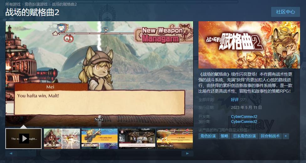 由CyberConnect2开发的“福瑞”策略RPG《战场的赋格曲2》现已正式发售,登陆PS5、PS4、Xbox Series X|S、Xbox One、Switch、PC和XGP,暂不支持中文,Steam版售价206元,该作是2021年游戏《战场的赋格曲》的续集,讲述了前作一年后发生的全新故事。 为了调查被回收的塔拉尼斯,孩子们被找去首都法老。 可不知为何,塔拉尼斯在调查中途突然失控,载着5个孩子逃走。 于是马尔托和未被带走的孩子们乘上了曾是敌人兵器的塔拉斯库斯,开始追踪塔拉尼斯。 【战术性更强的战斗系统!】 除了听取玩家的意见,改善了操作性外, 通过全新的灵魂加农炮和玛娜嘉尔姆,玩家更可体验到极致的战术性! 【充满“抉择”而更加扣人心弦的路线进行!】 通过更多的路线分歧,让抉择更加有趣了! 飞行船辅助系统还进一步扩大了抉择的范围! 【由抉择的累积创造新故事的事件系统!】 故事中的抉择会累积到决断量表并对事件产生影响! 玩家可以体验到亲自参与故事的乐趣! |