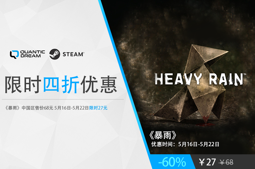 5月16日至5月22日,Quantic Dream工作室旗下游戏产品《暴雨》迎来全新限时优惠!仅需史低价格27元,享受最新4折钜惠!《暴雨》绝不是那种快餐游戏,你的每一个举动都会为剧情带来变化,他们的故事将变成你的故事,体验一场融合了冒险和心理恐惧的视听盛宴。 Quantic Dream工作室首创“交互式剧情”的概念,旗下游戏允许玩家通过多个选择来改变故事走向、探索结局。在《暴雨》中你将轮流扮演4个角色,他们的命运各自叙述出整个故事的一部分。 《暴雨》不会判定你的行动是成功还是失败。游戏没有绝对的对或错,不论结果如何,游戏都会继续下去,而且按照你的行动而改变流程。你在游戏中的行动会造成可大可小的效果,从一个场景的不同结果,到更大型的变化。 游戏简介 故事发生在美国东海岸的一座小城镇,每当暴雨倾盆而下的时候警方便会在雨水中发现一具8到10岁左右的男孩的尸体,手中握着折纸,胸口放着一朵兰花,受害者已达8人,至今无法破案...... Ethan Mars(伊森·马尔斯)在一场车祸中失去了儿子Jason(杰森),两年后他在得知二儿子Sean(肖恩)被折纸杀手抓走时,他发誓不惜一切也要救回儿子。 人称”折纸杀手“的杀人犯在沉寂了四天后,悄悄地展开猎杀。之所以被称为”折纸杀手“,是因为他在每处犯罪现场都会留下折纸作为他令人毛骨悚然的犯罪签名。 四个角色中的每一位都有着自己的动机,跟随着自己的线索上下探寻。你将亲手掌控他们的行动,阻止又一个人成为这名杀手的手下亡魂。你的选择将决定这个故事的结局…… 关于Quantic Dream工作室 Quantic Dream是一家法国游戏工作室,由大卫·凯奇于1997年在巴黎创立,以旗下高质量的游戏作品而闻名全球。他们在艺术和技术领域积极创新,以玩家情感为基础打造交互式的游戏体验,允许玩家通过多个选择来改变故事走向、探索结局。2005年,工作室推出了首个“互动电影式”的游戏。之后工作室与索尼互动娱乐合作,推出了三个爆款游戏——《暴雨》、《超凡双生》和《底特律:化身为人》。这些游戏都由Quantic Dream独立设计制作,已斩获超过250项全球奖项,对游戏叙事方式的发展作出了重要贡献。过去几年,Quantic Dream曾与多个世界知名艺术家合作,包括大卫·鲍伊、汉斯·季默、艾伦·佩吉、威廉·达福、克兰西·布朗、杰西·威廉姆斯等等。 |