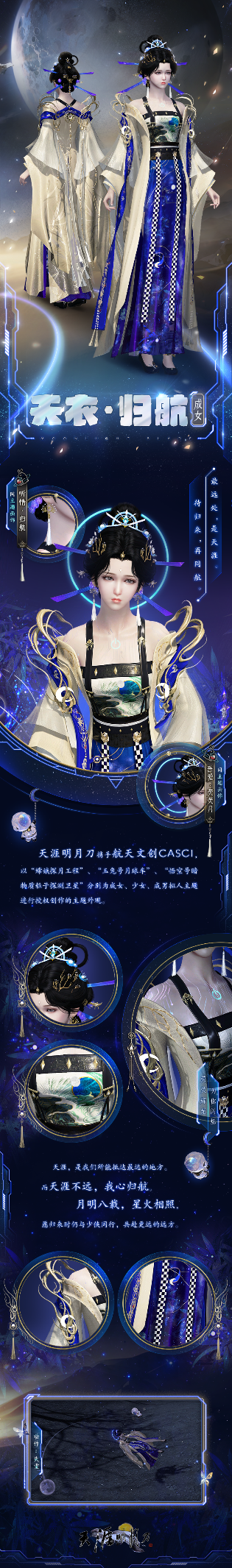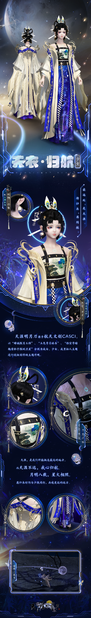 天涯明月,相伴八载。全新版本“归航”现已上线,《天涯明月刀》天赐节暨天刀IP八周年盛典开启,多平台互动直播,观看还能赢取惊喜福利~ “归航”版本活动来袭 海量福利情报一图了解 开封城内已装点一新,游戏内外缤纷活动、一大波生日回馈和庆典福利同贺天刀八周年! ▼▼查看您的天赐节福利锦囊▼▼ 航天主题外观【天衣·归航】也同步登录江湖,现在上线还可领取萌趣背饰【灵殊·星辰火箭】,一起“归航”江湖再启新征程! 天赐盛典即将开启 多平台直播同贺佳节 直播节目单 八年共贺,辉光幕影。本次直播将在5月28日18:45开启,节目内容共分为四章。 颇具火星范的华服走秀,看俊男靓女展现星火华服之美;联名主题华裳展示,一同品鉴刀刀天衣的精美细节;火星基地科普与探营,揭秘联名华服起源航天器;策划还将挑战航天员级别的“真话大挑战”,为少侠们带来新鲜爆料~最后,还有周年庆神秘彩蛋揭晓,不知道又会带来怎样的惊喜内容呢? 节目单刀哥放在下方啦,一来看看吧~ ▼▼查看您的天赐节直播盛典节目单▼▼ 直播福利大放送 本次天刀IP八周年天赐节庆典由斗鱼、微信视频号联合直播,少侠们可前往杭州·星河巨幕观览领取直播福利!直播期间更会掉落丰厚惊喜福利,各位少侠可前往天涯明月刀公众号预约直播哦! 这次的直播将在甘肃金昌火星1号基地——中国首个火星模拟生存体验基地进行,在甘肃金昌的戈壁上,模拟火星环境建立一个自给自足的生态圈,并围绕火星生态圈为大众打造一个具有科普内容、研学教育、娱乐场景等为一体的泛大众旅游目的地。 明月八载 星火相照 航空合作外观细节抢先看 最远处,是天涯。待归来,再同航。 【天衣·归航】是天涯明月刀携手航天文创CASCI,以“嫦娥探月工程”、“玉兔号月球车”、“悟空号暗物质粒子探测卫星”分别为成女、少女、成男拟人主题进行授权创作的主题外观。 当中国航天邂逅国风江湖,华服中有星辰也有大海,如此中国式宇宙级别的浪漫绝对让人叹为观止! 【天衣·归航】三体型图透&视频 天涯,是我们所能抵达最远的地方。 而天涯不远,我心归航。 月明八载,星火相照, 愿归来时仍与少侠同行,共赴更远的远方。 ▼▼天衣·归航三体图鉴赏▼▼ 【天衣·归航】女款浅金色外套搭配蓝色长裙,裙摆上星沙闪烁,如将浩瀚夜空藏纳其中,尽显东方华贵之美。 男款以白金色为主,肩饰上繁复独特的花纹华丽大气,箭袖设计利落潇洒,令人怦然心动。 ▼▼天衣·归航外观视频鉴赏▼▼ 【天衣·归航】华丽cos展示 本次推出的【天衣·归航】外观的实体华服首秀,将在5月28日天赐节盛典直播中登场。 ▼▼天衣·归航外观cos鉴赏▼▼ 成女@林一蓝? 少女@莉莉崽? 成男@王若若 柔和的轻纱随风飞扬,紫色的裙衫与繁复的簪饰相互应和,国潮与科技,既激烈碰撞,又相互融合,天涯遥遥,静待心的归航。 像是误入了迷途,在闪着荧光的通道格格不入。光环明灭,在笃定的碰触里揭示航行掌控者的身份。归航,是心之所向。 像是误入了迷途,在闪着荧光的通道格格不入。光环明灭,在笃定的碰触里揭示航行掌控者的身份。归航,是心之所向。 点点星光落于少侠掌心,抬眸直直望来,归航路遥,须与金兰好友携手同行! 明月八载天涯路,星火归航待君归。 愿与少侠同去同归,共贺生辰,赴十年之约。 更多精彩内容,敬请关注刀哥! |