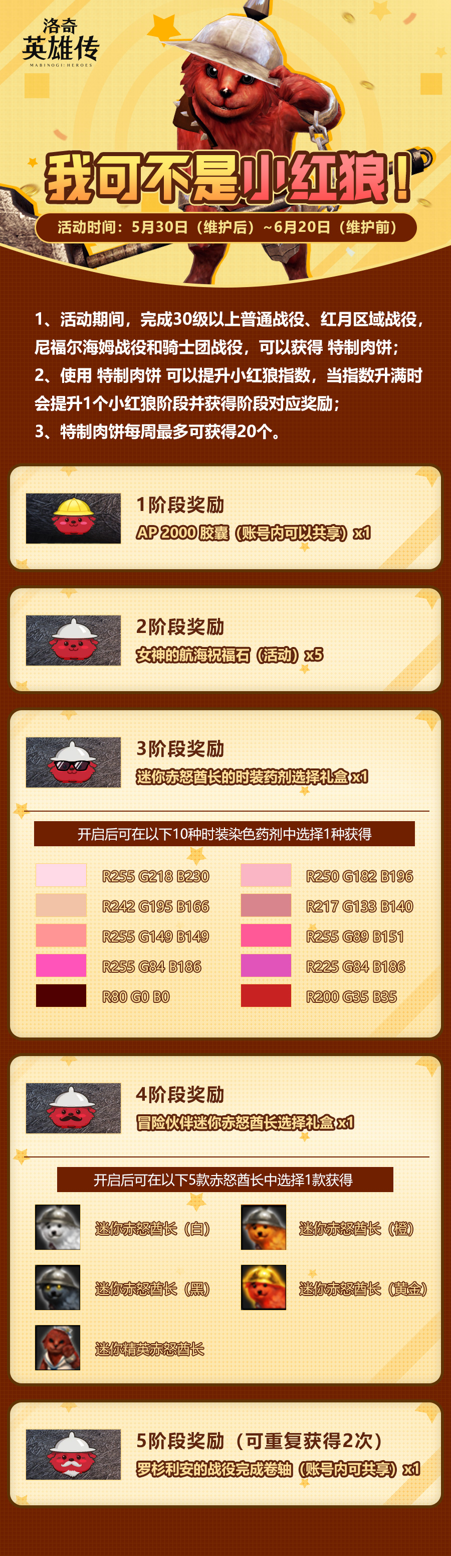 5月的《洛奇英雄传》可谓热闹非凡,不仅上线了一批新时装与经典时装外观供英雄们选择,英雄们还可参与至一系列的福利活动!在5月即将结束,迎来童趣6月的时刻,咱们游戏内福利活动再升级,大家不仅可以喂养可可爱爱小红狼,参与特殊副本活动还可赢取实用道具哦! 【我可不是小红狼!】 在5月30日维护后至6月20日维护前,完成指定战役,可以获得“特制肉饼”(每周最多可获20个),使用肉饼喂养小红狼可以提升指数,每提升一个阶段都能获得指定奖励哦! 【特殊副本活动】 在5月30日维护后至6月20日维护前,完成特殊副本后,英雄们会从战役掉落中获得“特殊副本活动礼盒(每周可获得10个)”。英雄们可从中获得神秘的纯金手镯礼盒、神秘的纯银手镯礼盒等实用道具其中之一! 以上,就是《洛奇英雄传》于5月30日上线的两大活动,福利升级,等待英雄们参与啦! 《洛奇英雄传》运营团队 5月30日 |