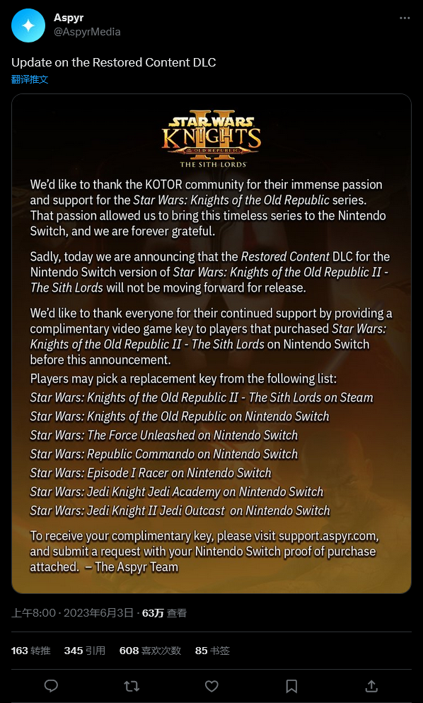 开发发行商 Aspyr Media 今天(6 月 3 日),将取消《星球大战:旧共和国武士 II – 西斯领主》Switch 版本的恢复内容 DLC。 在推特上的声明中官方表示:“今天我们遗憾的宣布,任天堂 Switch 版本《星球大战:旧共和国武士 II – 西斯领主》的恢复内容 DLC 将不会继续发布。” “我们想要通过给在这条公告前购买了《星球大战:旧共和国武士 II – 西斯领主》任天堂 Switch 版本的玩家送出补偿游戏 Key 以表达对他们持续支持的感谢。” 在公告中,官方表示购买了以下游戏的人可以获得补偿游戏 Key: · Steam上的《星球大战:旧共和国武士II》 · Switch 上的《星球大战:旧共和国武士》 · Switch《星球大战:原力释放》 · Switch《星球大战:共和国指挥官》 · Switch《星球大战:Episode I Racer》 · Switch《星球大战:绝地武士3绝地学院》 · Switch《星球大战:绝地武士2绝地放逐者》 恢复内容 DLC 是一个粉丝志愿者项目,旨在补充《星球大战:旧共和国武士 II》缺失的内容,并修复技术问题。它于 2015 年得到 Aspyr Media 的正式认可。 |