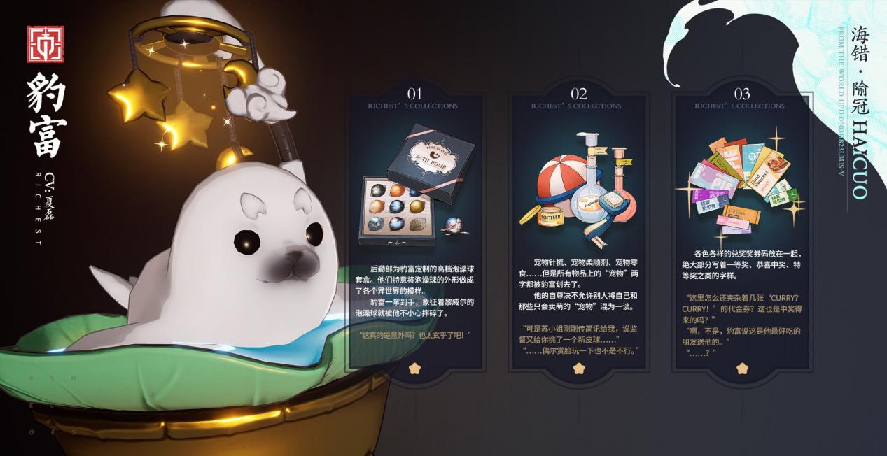 于世界交点之处,逢似曾相识之人。《白荆回廊》是一款异世交汇即时多维战斗RPG,在这里,你将作为“白荆科技”的最高执行官,与众多从异世界而来、使用神秘力量的“同调者”相遇,携手抵御前所未见的风险,去探寻引发动荡的缘由。 白荆回廊官网及TAPTAP现已正式开启预约,欢迎各位玩家前往! 「海错世界人物介绍」 ☆豹富 【海错·隃冠族】 来自海错的隃冠族。从豹富来到海临的第一天起,他就成为了白荆科技传说级别的存在。其好运程度令人咋舌——毕竟不是每位同调者从天隙通道一路俯冲着陆都能毫发无损的。豹富看起来也早就习惯了这一点,甚至不以为意,然而他的理所当然只会加剧员工们内心的悲愤。但请相信,他真的没有恶意。——如果实在气不过,可以大力拍打他滚圆光滑的肚皮。 「博物学会资料馆」 关于该同调者的情报于森罗历1121年?月?日?收录- 非“宠物”用品 [1]后勤部为豹富定制的高档泡澡球套盒.他们特意将泡澡球的外形做成了各个异世界的模样.豹富一拿到手,象征着黎威尔的泡澡球就被他不小心摔碎了. [2]宠物针梳、宠物柔顺剂、宠物零食……但是所有物品上的“宠物”两字都被豹富划去了.他的自尊决不允许别人将自己和那些只会卖萌的“宠物”混为一谈. [3]各色各样的兑奖奖券码放在一起,绝大部分写着一等奖、恭喜中奖、特等奖之类的字样. 超豪华海鲜转盘 [1]特等奖:超大蒂尔莫龙虾、芝士焗帝王蟹腿. [2]一等奖:[鲍贝]海鲜刺身拼盘、松鼠鳜鱼、水煮鱼片、夏日特制冰沙. [3]二等奖:……. [4]白荆科技第二食堂将为每位在职员工及协议范围内的同调者提供特别套餐服务,一切可根据喜好及需求定制. 语音收录 何以解忧,唯有豹富。 情报来源:白荆科技 //编录人:XXL师傅 |