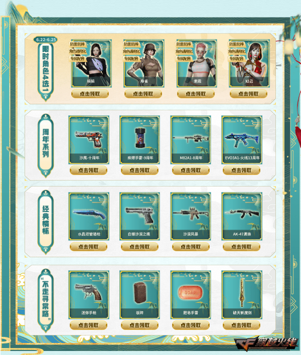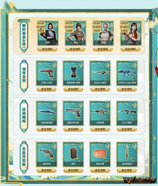 6月期间,《穿越火线》(简称:CF)开启海量福利活动,为广大CFer送上斯泰尔-墨兰、毁灭-墨兰、沙漠之鹰-紫罗兰、新USP-墨兰等多种好礼。适逢端午佳节来临,玩家仅需参与游戏即可赢取超多奖励,体验CFHD玩法还有更多加码福利相赠,千万不要错过! 6月22日至6月24日期间,玩家参与游戏即可获得领取“端午风暴”补给的次数。包括柯尔特-涂鸦、Colt-宇航兔兔、ScarLight-白虎及灵狐者-黄金海岸在内的多重好礼均有机会通过本次活动免费领取。 活动期间,CFer在端午风暴中获得的“任选可分享”类道具,将有机会选择赠送给自己的好友,好友将无条件获得该道具,任一道具被好友领取后还可以开启福袋粽子随机获得1件加码补给。并且玩家也可以领取来自好友的兄弟码,最多领取2次其他人分享的好礼。 不仅如此,玩家来到页面预约周年庆主题活动还可以每周抽奖1次,全服预约量达到指定指数,即升级解锁火线盛典的奖励!若全服预约达到500W,火线盛典将会送出英雄级武器! 玩家游戏一局后还可以领取全新上线的斯泰尔-墨兰,免费获得此后绝版的墨兰系列武器,同时还可抽奖1次,有机会随机获得龙鳞、AWM-PINK或迷你手枪等好礼。 6月22日至30日期间,CFer每天游戏一局还可以进入活动页面选择一件道具领取,累积游戏3天后,可开启超稀有宝藏岛,当天游戏一局,即可再选择一件装备领取。值得注意的是,如果CFer能找到宝藏岛主的邀请密码,则最多可选择2件补给道具,否则仅能选择1件进行领取。 6月30日前,玩家可以无条件领取魂·毁灭-墨兰或者选择游戏一局领取毁灭-墨兰(当天仅能领1件,如果想要领取两个则需要玩家成功分享且游戏两天),领取后只需充能至100%即可一直保留,否则道具将被回收! 玩家在活动期间还可以参与火线嘉年华预热主题活动领取加码福利,每天游戏1局后即可选择1件收藏级道具进行领取,每天只能领取一件,最多可领2件。如果CFer想拥有更多福利,则可以选择当天登录掌火额外领取1件,但通过掌火任务不能领取“限时角色”里面的角色! 此外,本次活动还有零妹妹的暂存箱活动再次上线,开启暂存箱后满足条件即可获得部分此前活动限时放送过的武器道具,输入好友箱码还有机会开启好友的暂存箱,满足条件后也可以领取好友暂存箱的武器道具,并且双方组队后都进行1局游戏还可以开启超级宝箱,每人选择1件心仪的装备收入囊中。 此外,还有7.15活动提前预约渠道开启,玩家在6月22日至6月25日期间,只需任意游戏一局即可预定三防斯沃特-X!每次成功预定,均可减免后续续约门槛,2次最多可减免15天续约! 而在本次的聚宝盆活动中,无论是选择加入团队赢取团队聚宝盆奖励,还是孤身奋战领取个人聚宝盆奖励,只要对应等级达到指定级数后即可领取相应礼包。详细来说,团队终极奖励仅需团队所有人总计达到20级,而个人终极奖励仅需10级即可领取,根据团队人数还可以领取不同期限的COP357-独角兽,团队达到10人即可获得非期限版本并额外获得激浪烟雾弹。 活动期间,玩家邀请1个指定好友(5.1至今未登录)登陆游戏,可获得1好友积分,er邀请非指定好友登陆游戏,也可以获得少量好友积分,消耗好友积分,即可兑换/秒杀潘多拉-甜心教官、曼陀罗-礼服、唐刀-青花瓷或铁骑玩偶。 玩家进入活动页面还可以抽取专属优惠价,可以超低价格购买全新猫耳设计的粉色烟雾保护头盔,累计好友助力积分还能再次降低购买价格,最低8QB即可购买原价888QB的烟雾保护头盔-粉猫儿。 此外,还有黑骑士-暗月皮肤与黑龙-暗月皮肤参与优惠活动,累计好友积分后也可以选择兑换以上皮肤的优惠价格,仅需5积分即可8QB购买。此前已经购买过雷神-暗月或修罗-能量核心的玩家达到5积分还可以额外减免3QB。 此外,玩家登录CFHD还可以获得惊喜抽奖机会,登录最高可得10连抽机会,有机会免费获得加特林-炼狱、Barrett-金色蔷薇、M4A1黑骑士等好礼,6月14日12:00:00~7月12日23:59:59期间,CFHD玩家每周登录或邀请好友可积累心愿点,抽Q币好礼,还可以参与瓜分150万Q币的超级活动! 针对未完善过手机号的CFer,通过本次活动进行完善还有专属奖励相赠,绑定手机即可领取CF专属奖励愤怒的公牛左轮-炫彩+属性变更券*1与CFHD专属奖励挂饰-机械盾牌。 除以上活动之外,还有CF云游戏玩法已经开启,无需下载30秒即玩,完成平台任务还有专属好礼相赠。端午盛典活动震撼来袭,还有CF周年庆活动即将开启,提前预约即可领取海量好礼,总计预约人数达标还有优惠折扣限时放送! 个人战绩全掌握、版本爆料提前看、武器福利领不停!尽在《穿越火线》唯一App《掌上穿越火线》。 关于腾讯游戏 腾讯游戏成立于2003年,是中国最大的网络游戏社区,也是全球用户最多的数字娱乐平台。 腾讯游戏在全球连接超过8亿的用户,全球每天有数亿人次的用户在畅享腾讯游戏的产品。 2019年腾讯游戏正式发布全新的品牌理念。腾讯游戏将秉持初心,为全球游戏玩家带来快乐的同时,探索游戏更广泛的价值。 Spark More!去发现,无限可能 |