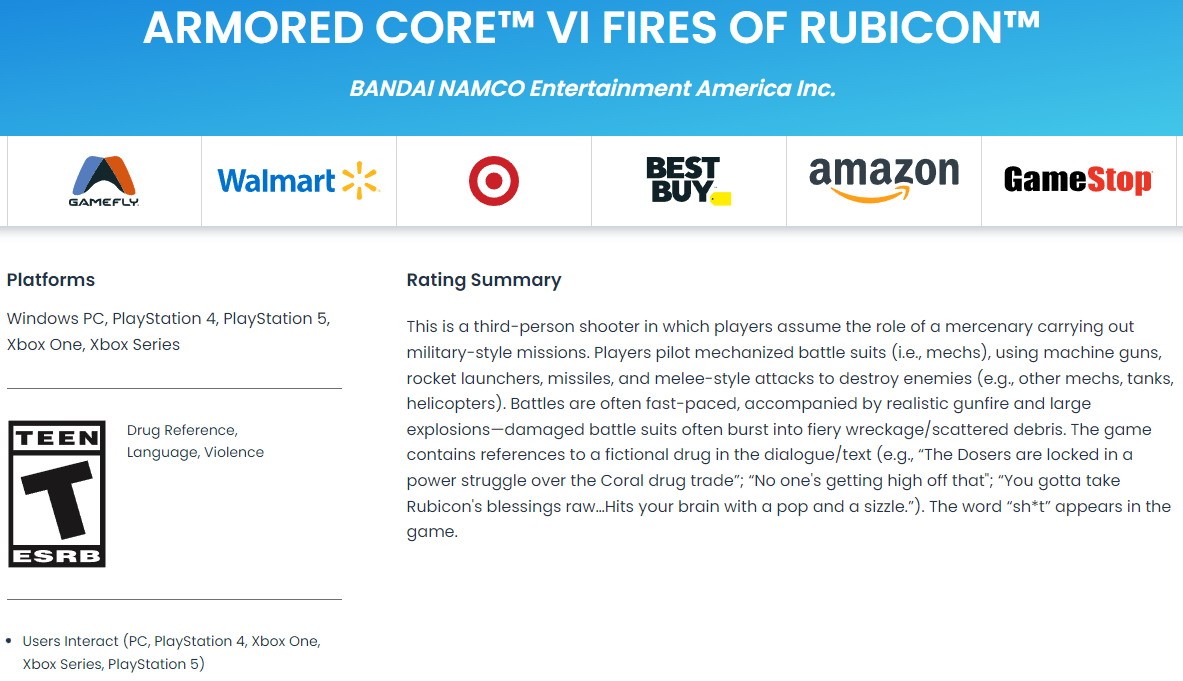 《装甲核心6》被ESRB评为T级 有暴力元素和不文明用语