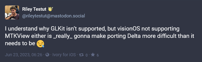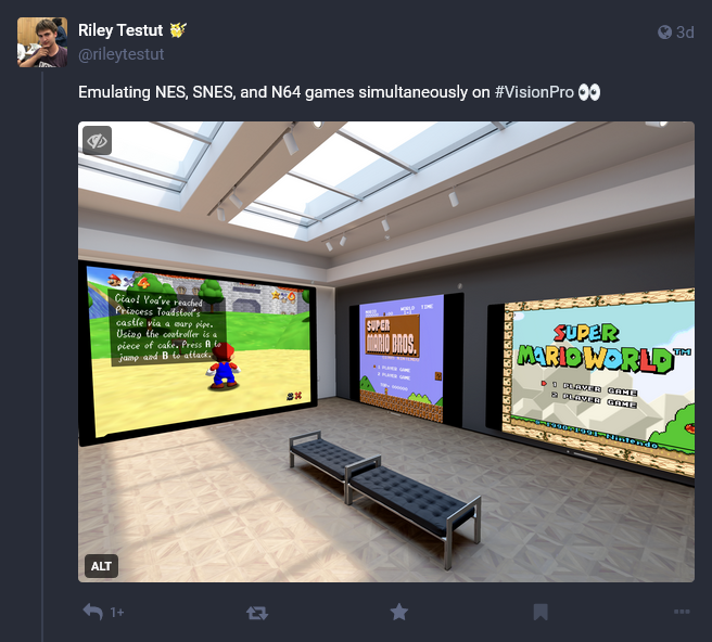 针对 iOS 系统的 Delta 模拟器开发者 Riley Testut 近日在社交网站 Mastodon 上分享了一张截图,展示他成功的在苹果新?VR/AR 眼镜 Vision Pro 的开发版本上运行了多款《马里奥》游戏。 最厉害的是,Vision Pro 不仅仅能够运行某一款任天堂游戏,Testut 同时运行了 NES、SNES 和 N64 主机版本的三款不同的《马里奥》游戏。看起来就像是一个复古游戏博物馆! 根据 Testut 在评论区中的补充,他表示因为新的 visionOS(针对 Vision Pro 推出的新系统)不支持 OpenGL 的 GLKit 框架和 Metal 框架的 MTKView,这会导致将 Delta 模拟器移植到新系统上变得非常困难。 而且考虑到这是软件开发者硬件:意味着当面向消费者的 Vision Pro 推出时,如果在不“越狱”的情况下,是不可能原生支持运行模拟游戏的。想想高达 3500 美金的价格,你真的敢让它的保修因此报废吗? Testut 除了开发了 Delta 模拟器,还开发了一款名为 AltStore 的第三方商城。通过这个商城应用能够下载完整版的 Delta 模拟器以及其他无法进入苹果官方 App Store 的应用。除此之外,他的首个项目名为 GBA4iOS 的 Game Boy 模拟器,然而在 2014 年苹果和任天堂关停了该项目。 |