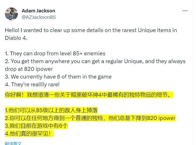 上线近一个月的暴雪大作《暗黑破坏神4》,当前已经迈入了新阶段。主播和其他核心玩家们的工作重心渐渐发生了转移,从冲级挑战回归到了游戏本身之上。 作为一款知名的“刷子”游戏,当《暗黑破坏神4》的玩家们等级达到一定层次时,竭力刷出足够稀有、优质的装备,就成为了大伙继续游戏的主要驱动力。 在《暗黑破坏神4》中,装备被分为普通白装、魔法蓝装、稀有黄装、传奇橙装以及独特装备几个等级。独特装备也就是玩家俗称的暗金装,属于稀有度最高的装备等级。然而就算是同一层级的装备,相互间也有差距。 暴雪设计师Adam Jackson,日前就亲自下场进行了解答。他不仅公布了最稀有的6件暗金装备的名单,还给出了一些建议和小技巧。作为《暗黑破坏神4》的游戏主创,Adam Jackson算是分享了一波官方攻略。 Adam Jackson在推文中表示:目前游戏中最稀有的装备有6件,这6件暗金装分别是「谐角之冠」、「末日使者」、「塞利格的溶解之心」、「无星夜空之戒」、「祖父」以及「安达利尔的仪容」。 这6个独特装备只能通过击杀85级以上的怪物,才能有几率获得。刷新地点跟其它的暗金装备一样,且装备必定具有820物品强度。当然啦,它们的掉率极低。根据玩家计算,平均1亿小时才能出一件。(所有玩家的总游戏时长) 此外,Adam Jackson还特别提到,当玩家每刷到一件暗金装备时,都有可能提升这6件装备出现的可能。所以短期内刷出多件暗金装备的玩家,会更容易出货,只是概率能提升多少就不好说了。因此这6件《暗黑破坏神4》中最稀有的暗金装备,依旧可遇不可求。 截止到目前,这6件最稀有的暗金装备,只有「谐角之冠」出现了两件。分别由韩国主播drlee_kor和一名中国台湾玩家所获取,并且后者还找过PDD想要转手。 不过PDD拒绝了这笔交易,自述主要考虑到三点理由:1.本人抵制RMT行为;2.装备属性偏低达不到预期;3.对方的账号是蛮子,不想换职业玩。(《暗黑破坏神4》无法交易装备,只能卖号) 而最终这位台湾玩家,还是找到其他人转手了这个账号,并以100万新台币(约合23万RMB)达成了交易。 随着此番设计师的亲自下场,上述提到这6件暗金装备算是被盖上了“官方钦定最稀有”的词条。除「谐角之冠」以外,其他暗金装也开始冒头。不难预见,接下来将会有越来越多玩家向着这个目标发起冲击。 那么在这近一个月的时间里,大家又出过哪些稀有装备呢? |