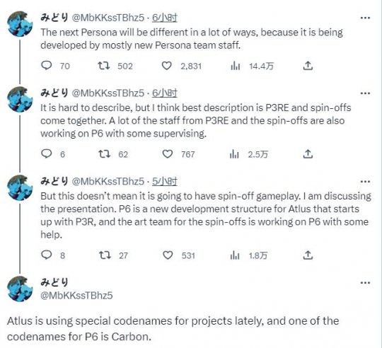 知名女神异闻录系列爆料人MbKKssTBhz5今天透露了一些《女神异闻录6》的最新情报,MbKKssTBhz5此前曾准确爆料过《女神异闻录5战略版》和《女神异闻录3:Reload》的相关消息,以下是爆料要点: ·《女神异闻录6》在很多方面有所不同,它由一个新团队负责开发 ·该作类似于《女神异闻录3:Reload》和衍生作品的结合,《女神异闻录3:Reload》和其他衍生作品的开发者也参与了《女神异闻录6》的开发,但这并不意味着新作拥有衍生游戏的玩法 ·《女神异闻录6》是Atlus从《女神异闻录3:Reload》开始设立新开发结构,衍生作品的美术团队也从《女神异闻录6》的开发中获得了一些帮助。 ·《女神异闻录6》的开发代号是Carbon ·可能会在明年与一款新衍生游戏一同公布 ·登陆平台暂时无法完全确定,但可以确定的是不会登陆旧主机,会有PS5版 |
