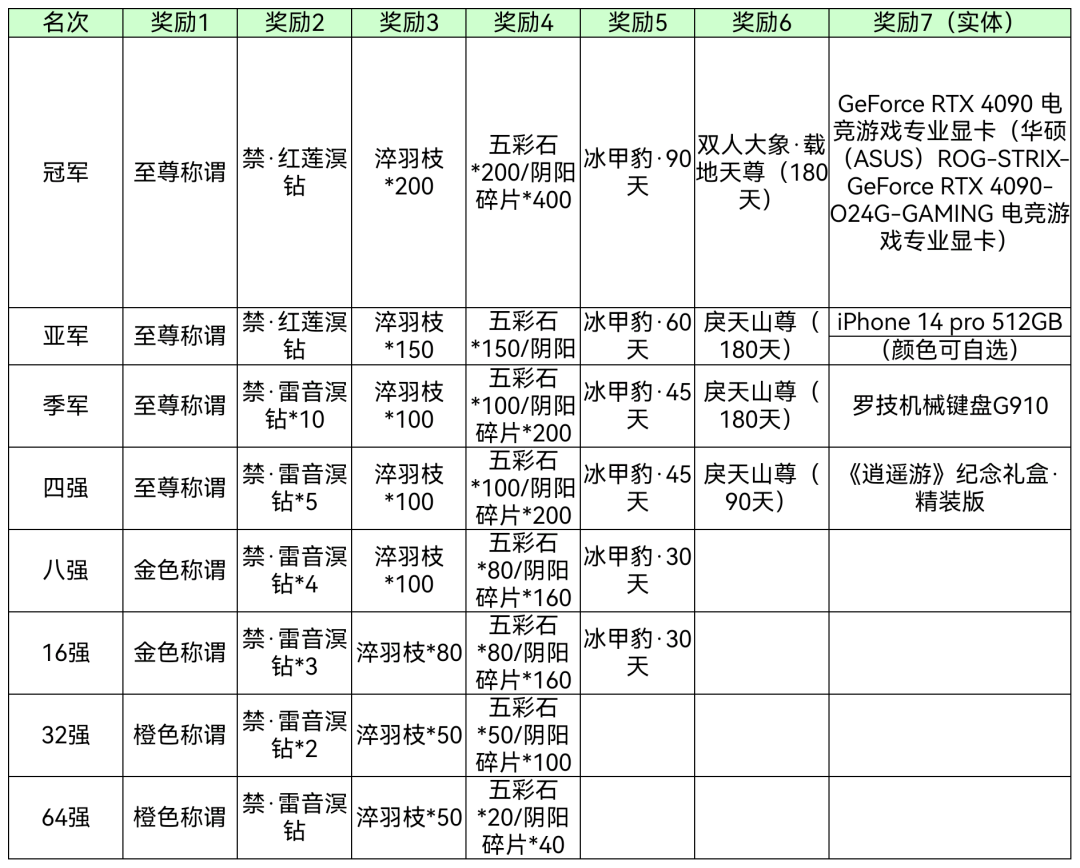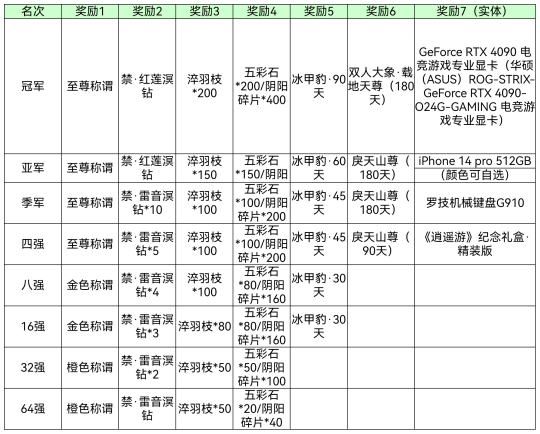 近日大荒可谓是热闹非凡,大家翘首以盼的问鼎天下·3V3标准号全国赛将于7月5日更新后正式开启!少侠们准备好迎战了吗? 令人惊喜的是,《天下3》不仅为本次竞赛准备了常规的奖励,而且加入了军饷瓜分机制、全民竞猜机制,还对四强队伍的奖励进行了“重量级”加码!GeForce RTX 4090 电竞游戏专业显卡、iPhone 14 pro、罗技机械键盘G910、《逍遥游》纪念礼盒·精装版等实体好礼的重磅加码势必会让战事更加激烈! 事不宜迟,下面一起来看看这次赛事的相关资讯吧! 赛程及赛事规则 本次问鼎天下赛事分为积分赛和淘汰赛,积分赛在7月5日-7月23日的每周五六日20-24时开放,7月24日凌晨1点积分赛正式结束,7月24日12:00公布64强名单。随后,淘汰赛将在7月29日下午开启,从64支队伍中决出四强。7月30日进行半决赛、季军赛和决赛。 积分赛期间,只要战队在线人数大于等于3,且至少有3人不同门派,战队内任一成员就可以在积分赛匹配期间进行战队报名。战队将拥有2000分的初始积分,战队积分达到2500分之前,负场不扣分。每一场胜负的加减分有所不同,具体与本队、敌方战队的积分有关。 竞技狂欢,瓜分千万军饷~ 淘汰赛终极好礼 问鼎天下赛事中,能走到淘汰赛的少侠,绝对是百里挑一的高手,而能从高手如云的队伍中脱颖而出的冠军,更是个中翘楚。 因此,本次赛事,《天下3》不仅为冠军队伍准备了常规的道具奖励,如至尊称谓、红钻、淬羽枝、珍贵坐骑,还为他们准备了每人一个的GeForce RTX 4090 电竞游戏专业显卡! 亚军、季军、四强队伍的奖励同样得到了加码,而且是战队成员人手一份哟~亚军队伍成员可获得iPhone14 pro(512GB);季军队伍成员均可获赠罗技机械键盘G910;四强队伍的少侠将获得《逍遥游》纪念礼盒·精装版! 全民瓜分海量军饷 不仅如此,为了鼓励少侠们积极参与竞技,感受对战的乐趣,《天下3》还为本届赛事准备了重磅奖励——千万军饷! 根据战队最终积分,少侠们可以参与瓜分不同的军饷奖池。战队积分最低只需要达到2400分,即可参与2000000军饷奖池的瓜分! 随着最终积分的逐渐增长,达到2850的战队,还可以参与最高额军饷奖池瓜分,该奖池内的高达6000000军饷! 积分达标奖励 除了军饷奖池,本次赛事还设置了积分达标奖励,鼓励少侠们为战队奖励、为个人成长全力出击。战队积分达到每达到一个目标时,战队成员可以获取问鼎天下声望,参与场次大于本战队总场次50%的少侠即可获取。 获得的问鼎天下声望,可以用于声望商店中换取各类珍贵道具,包括灵兽的灵化模具及培养道具、雷钻、大禹之法等。 全民竞猜,红莲溟钻、炼化收入囊中! 这般激情赛事,不仅是竞技爱好者们的狂欢,更是全体少侠的狂欢!伴随着赛事的进行,全民竞猜活动也恭候着大家的参与。 手握竞猜券,即可参与刺激的竞猜活动,赢取丰厚大礼哟! 竞猜券的获取也非常简单,少侠们可以使用近期投放的“问鼎天下竞猜凭证”在商店内兑换竞猜券,并用于竞猜。 即日开始,少侠们还可通过参与竞技场(包括日常赛和周末擂台赛),胜场可获得“问鼎天下竞猜凭证”。7月5日更新后,少侠们通过日常活跃度宝箱、天梯的胜场也能获得竞猜凭证。 本次竞猜将投放10个题目,所有题目在赛事开始时公布,具体选项将在每个题目开启竞猜时再公布,可以自行选择投注。同时,不同题目有不同的竞猜开始和截止时间,在截止时间之前可以随时变更答案,少侠们一定要留意好具体的时间哦~ 每猜对一次,可以获得一次积分暴击次数。最终积分将按照从高到低进行排序,排名前300的少侠均可获得奖励,其中,排名第一的少侠可获得【禁】红莲溟钻!2-300名少侠可获得炼化之灵,排名越高,可获得的炼化之灵也越多,最高可达2000点! 以上皆为先行爆料内容,还请大家以实际上线内容为准哦~ 面对如此丰厚的奖励,相信不少少侠早已按耐不住内心的欣喜了!心动不如行动,快拉上你的战场好友,准备来天下竞技场酣畅淋漓地燃战一场吧~ |