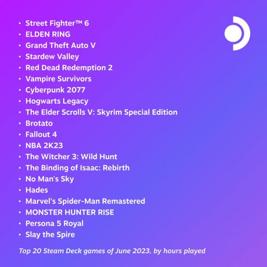 Steam Deck官推发布了2023年6月游玩时长最多的20大游戏,《街头霸王6》超越《艾尔登法环》登顶。