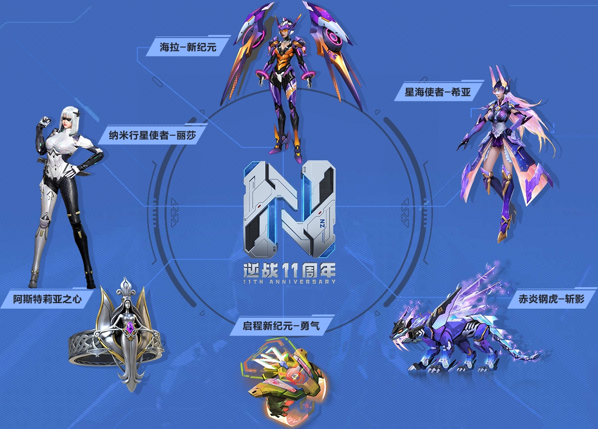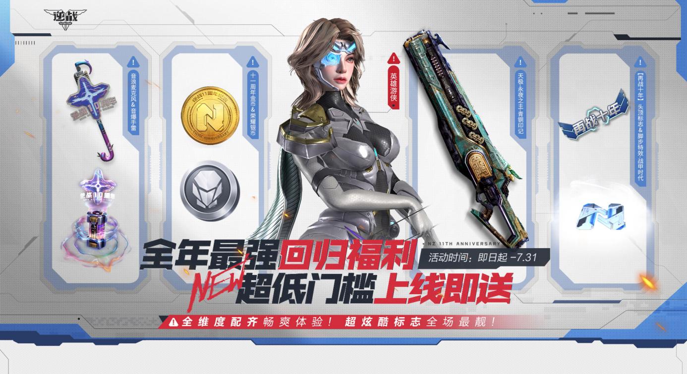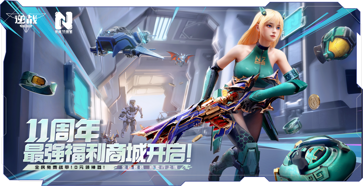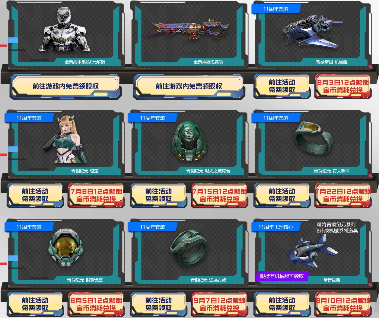 7月6日,逆战周年庆版本即将上线,11周年庆预热福利活动已提前开启,重磅内容包括:11周年最强福利商城开启,全民免费领战甲、神器零元购,还有全新套装拍卖行上线!十万Q币放送,领取青铜飞升,机械进化的11周年最强免费套装;全年最强回归福利,为你全维度配齐畅爽体验;全新青铜令牌登场,值得呼朋唤友一起来领取;还有逆战手机云游戏,暑期限时免费玩,限时畅享超清画质! 更多关于逆战11周年庆的详细内容,快来抢先了解参与吧! 战甲时代正来到,全新战甲登录免费领! 7月6日起,全民首套战甲“凌空”免费解锁,各位玩家可以在11周年活动期间登录游戏, 解锁战甲系统内的更多福利!通过战甲“凌空”,各位玩家可以施展二段跳、空中悬浮、震地冲击等技能,在闯关过程中,收获众多意想不到的全新体验。 全新神器零元购,云游戏暑期限时免费玩!在11周年庆期间,全新神器“灭烬之嗣”也能0元购,各位玩家只要满足累计登录天数,就可以将这把可以召唤地狱三头犬的神器免费收入囊中! 如果你想提前购入体验,也只需要通过满足登录天数,让神器价格不断降低,直至全额返还逆战点,实现零元购! 11周年庆典期间,还有暑期限时免费玩、限时享超清画质的逆战云游戏特权福利,全新网吧特权暑期升级内容,更有丰富的线上赛事、直播庆典及海量福利等你关注……逆战官网最新动态将持续更新,惊喜不容错过! 11周年最强福利商城开启! 活动时间:7月6日起 7月6日,11周年最强福利商城将开启,各位玩家每日登录游戏,即可开启11周年宝箱。 宝箱每周最多开启5次,每周一0点自动重置宝箱,每次保底必得11周年金币,最高可获得幻域周年套四件套或194史诗碎片,当日游戏30分钟,可获得1次补签机会,每周最多补签2次。 在活动期间,各位新老兵玩家,只要每日游戏60分钟,还可以领取11周年庆岁礼包,分别获得弥新、灵智铭钢、古迹遗剑、11周年金币、荣耀银币等奖励,还能以超低折扣购买最终之剑。 累计游戏5天,可以0元领取价值188元的2号背包组解锁卡或5000NZ点购物券(3天);7月15日后,累计游戏天数,还可以领取战甲风限定道具干将莫邪-纪元之光。 11周年拍卖行也将同期上线,在活动页面上,每日12点、19点会分别开启两场拍卖活动,拍卖持续2小时,各位玩家可以使用11周年金币出价,拍卖结束后将公布竞拍结果,竞拍成功后访问页面即可获取竞拍道具,次日0点将重置今日购买资格。 每周拍卖道具都将更新,快来看看你喜欢的道具是否在其中吧! 暑期战甲免费养成也将限时开启,各位玩家可以使用荣耀银币养成战甲! 各位玩家累计获得100-500时,分别可领取刚能强魄、凌空战魂*1、疾速武装、聚能核心、凌空战魂*4等战甲养成道具,千万别错过。 11周年最强福利套装也可以参与活动领取。各位玩家可通过消耗11周年金币,在周年金币兑换商城、周年猎场期限战备商城、周年塔防&PVP期限战备商城中兑换道具。 猎场、塔防、PVP战备商城每日游戏一局,即可领取道具,每个道具每日限1次,每月限3次。 青铜飞升,机械进化 活动时间:6月30日起 十万Q币,为你而来 从6月30日起,各位玩家仅需要每日完成游戏30分钟,即可获得卡片抽取机会×1,每日最多可获得3次。 通过抽取卡片,各位玩家可以收集到:溯光之戒-卡片、机械鲲-卡片、苍蓝视界头盔-卡片、图兰-卡片、影锻手环-卡片,以及万能卡、沾沾卡。 其中万能卡可以兑换任意一张卡片,而沾沾卡可以随机沾到朋友的一张卡片,卡片可以相互赠送。 集齐5张卡牌后,各位玩家就可以合成宝箱,参与瓜分奖励,不过你的游戏内等级必须达到40级以上才可以参与,越早集齐,瓜分的奖励越丰厚。 前30000名合成周年宝箱的玩家,可以获得Q币宝箱+NZ点宝箱+NZ点购物券宝箱的奖励;30001-111111名合成周年宝箱的玩家,必得NZ点宝箱+NZ点购物券宝箱; 111111名之后合成周年宝箱的玩家,必得NZ点购物券宝箱。 11周年限定套装,机械飞升全民享 6月30日-8月14日,各位玩家可以通过活动内的战令宝库,获取智械套装角色的前置角色:青铜纪元-琉萤。完整获得青铜纪元套装后,可通过后续的任务获取机械鲲,将青铜纪元套装升级为11周年庆典最强免费套装的最终形态:智械帝国套装。 智械帝国套装包括:智械帝国-机械鲲、智械帝国-图兰、智械帝国-溯光之戒、智械帝国-挑战者背包、智械帝国-影锻手环、智械帝国-苍蓝视界头盔。 当玩家装配6件时:按T+6释放神武宝库时,额外随机获得一种帝国至高增益,效果不重复触发,所有增益触发一遍后进入第二轮循环。 易伤:每秒减少10点血量,攻击力提升,持续10秒; 神速:射速获得强化提升,持续10秒; 狂暴:暴击率获得强化提升,持续10秒; 疾行:移动速度获得强化提升,持续5秒; 吸血:攻击可以回血,持续10秒,最多可回恢复100血量; 大富翁:猎场击杀小怪获得额外金币,单次最高可得5万金币,猎场每局最可得15万金币;塔防击杀小怪获得额外金币,单次最高可得500金币,塔防每局最可得2000金币; 护佑:场上所有玩家回复100点血量; 天赐:同时激活易伤、神速、狂暴、疾行、吸血、大富翁、护佑效果。 战令宝库分两个阶段开放,6月30日-7月6日 14:00为预热期,开放1-10级; 7月6日14:00-8月14日为冲刺阶段,开放11~50级,每级经验值均为25; 钛金零件和强能核心可前往赛季提升武器强化等级; 十一周年金币可于十一周年商店兑换终极好礼。 战令宝库升级至50级时,即可领取青铜纪元-琉茧或十