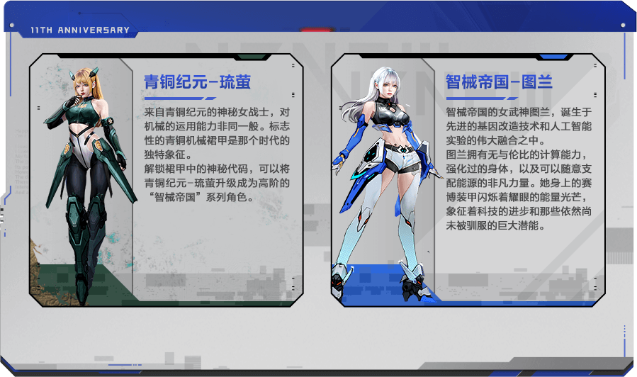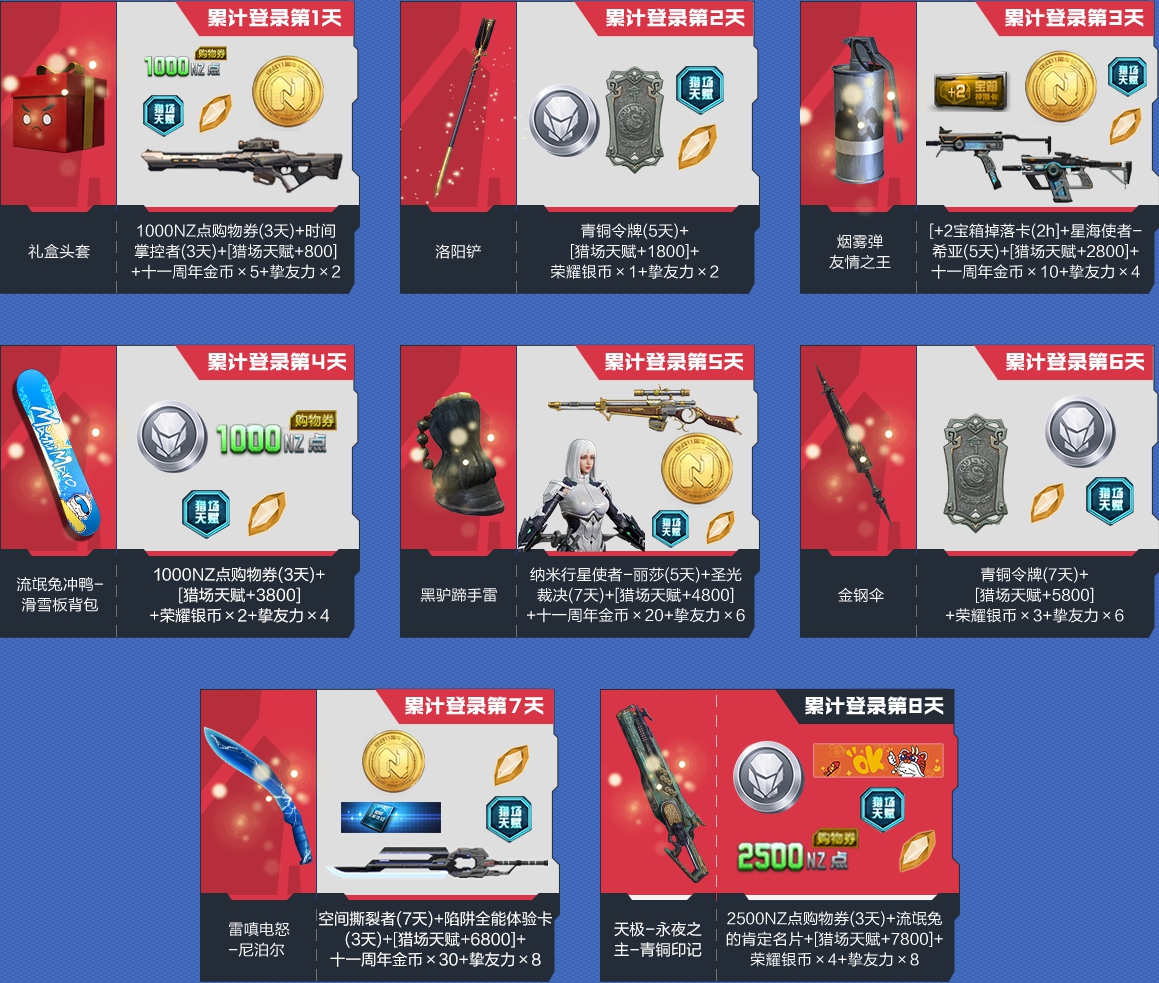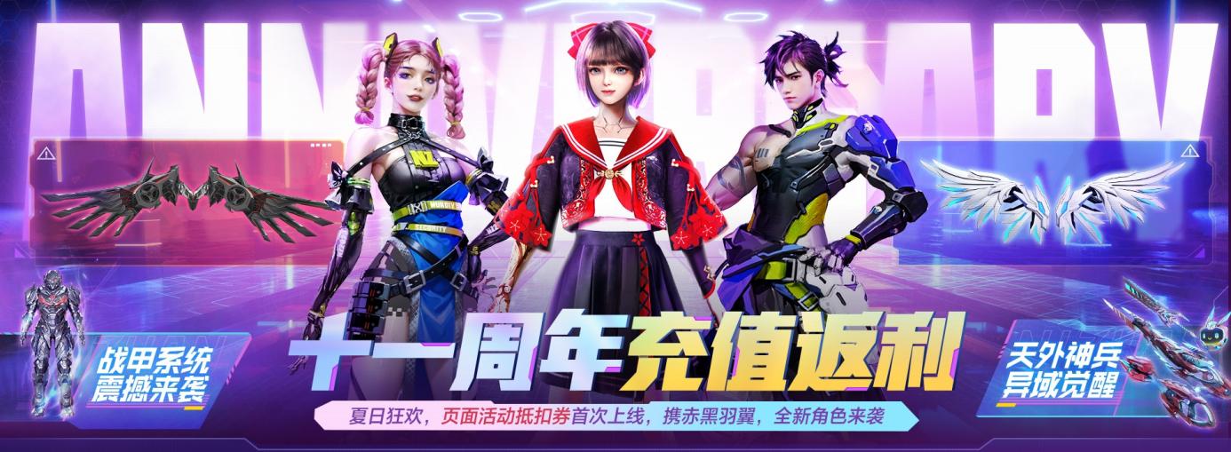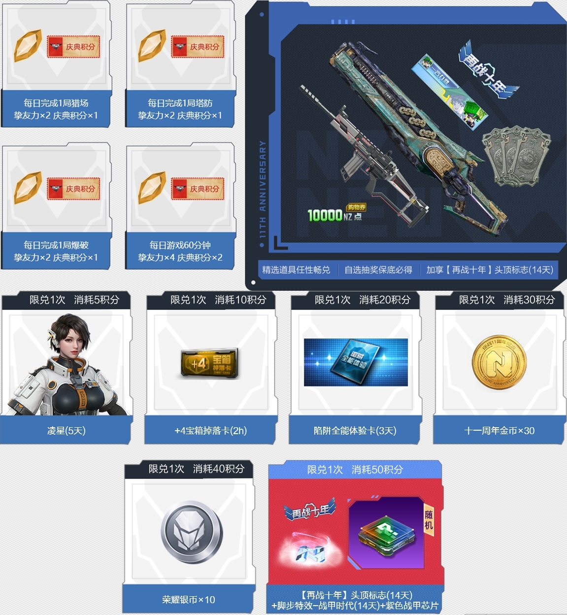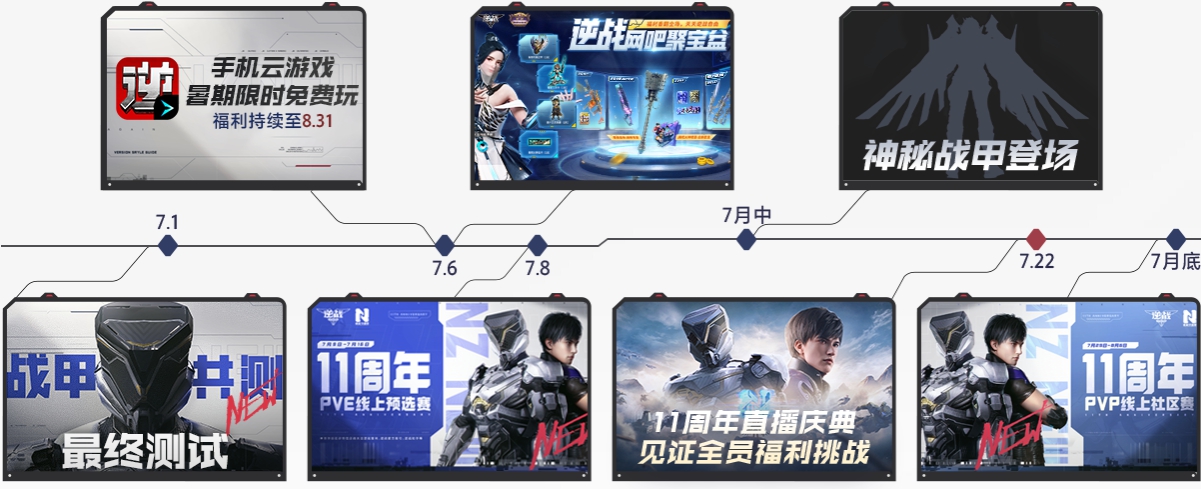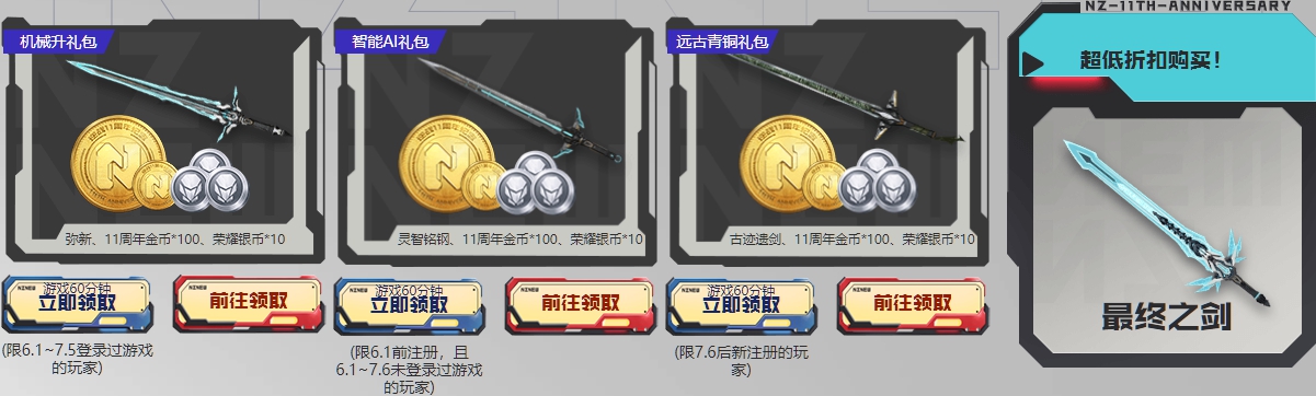 7月6日,逆战周年庆版本即将上线,11周年庆预热福利活动已提前开启,重磅内容包括:11周年最强福利商城开启,全民免费领战甲、神器零元购,还有全新套装拍卖行上线!十万Q币放送,领取青铜飞升,机械进化的11周年最强免费套装;全年最强回归福利,为你全维度配齐畅爽体验;全新青铜令牌登场,值得呼朋唤友一起来领取;还有逆战手机云游戏,暑期限时免费玩,限时畅享超清画质! 更多关于逆战11周年庆的详细内容,快来抢先了解参与吧! 战甲时代正来到,全新战甲登录免费领! 7月6日起,全民首套战甲“凌空”免费解锁,各位玩家可以在11周年活动期间登录游戏, 解锁战甲系统内的更多福利!通过战甲“凌空”,各位玩家可以施展二段跳、空中悬浮、震地冲击等技能,在闯关过程中,收获众多意想不到的全新体验。 全新神器零元购,云游戏暑期限时免费玩!在11周年庆期间,全新神器“灭烬之嗣”也能0元购,各位玩家只要满足累计登录天数,就可以将这把可以召唤地狱三头犬的神器免费收入囊中! 如果你想提前购入体验,也只需要通过满足登录天数,让神器价格不断降低,直至全额返还逆战点,实现零元购! 11周年庆典期间,还有暑期限时免费玩、限时享超清画质的逆战云游戏特权福利,全新网吧特权暑期升级内容,更有丰富的线上赛事、直播庆典及海量福利等你关注……逆战官网最新动态将持续更新,惊喜不容错过! 11周年最强福利商城开启! 活动时间:7月6日起 7月6日,11周年最强福利商城将开启,各位玩家每日登录游戏,即可开启11周年宝箱。 宝箱每周最多开启5次,每周一0点自动重置宝箱,每次保底必得11周年金币,最高可获得幻域周年套四件套或194史诗碎片,当日游戏30分钟,可获得1次补签机会,每周最多补签2次。 在活动期间,各位新老兵玩家,只要每日游戏60分钟,还可以领取11周年庆岁礼包,分别获得弥新、灵智铭钢、古迹遗剑、11周年金币、荣耀银币等奖励,还能以超低折扣购买最终之剑。 累计游戏5天,可以0元领取价值188元的2号背包组解锁卡或5000NZ点购物券(3天);7月15日后,累计游戏天数,还可以领取战甲风限定道具干将莫邪-纪元之光。 11周年拍卖行也将同期上线,在活动页面上,每日12点、19点会分别开启两场拍卖活动,拍卖持续2小时,各位玩家可以使用11周年金币出价,拍卖结束后将公布竞拍结果,竞拍成功后访问页面即可获取竞拍道具,次日0点将重置今日购买资格。 每周拍卖道具都将更新,快来看看你喜欢的道具是否在其中吧! 暑期战甲免费养成也将限时开启,各位玩家可以使用荣耀银币养成战甲! 各位玩家累计获得100-500时,分别可领取刚能强魄、凌空战魂*1、疾速武装、聚能核心、凌空战魂*4等战甲养成道具,千万别错过。 11周年最强福利套装也可以参与活动领取。各位玩家可通过消耗11周年金币,在周年金币兑换商城、周年猎场期限战备商城、周年塔防&PVP期限战备商城中兑换道具。 猎场、塔防、PVP战备商城每日游戏一局,即可领取道具,每个道具每日限1次,每月限3次。 青铜飞升,机械进化 活动时间:6月30日起 十万Q币,为你而来 从6月30日起,各位玩家仅需要每日完成游戏30分钟,即可获得卡片抽取机会×1,每日最多可获得3次。 通过抽取卡片,各位玩家可以收集到:溯光之戒-卡片、机械鲲-卡片、苍蓝视界头盔-卡片、图兰-卡片、影锻手环-卡片,以及万能卡、沾沾卡。 其中万能卡可以兑换任意一张卡片,而沾沾卡可以随机沾到朋友的一张卡片,卡片可以相互赠送。 集齐5张卡牌后,各位玩家就可以合成宝箱,参与瓜分奖励,不过你的游戏内等级必须达到40级以上才可以参与,越早集齐,瓜分的奖励越丰厚。 前30000名合成周年宝箱的玩家,可以获得Q币宝箱+NZ点宝箱+NZ点购物券宝箱的奖励;30001-111111名合成周年宝箱的玩家,必得NZ点宝箱+NZ点购物券宝箱; 111111名之后合成周年宝箱的玩家,必得NZ点购物券宝箱。 11周年限定套装,机械飞升全民享 6月30日-8月14日,各位玩家可以通过活动内的战令宝库,获取智械套装角色的前置角色:青铜纪元-琉萤。完整获得青铜纪元套装后,可通过后续的任务获取机械鲲,将青铜纪元套装升级为11周年庆典最强免费套装的最终形态:智械帝国套装。 智械帝国套装包括:智械帝国-机械鲲、智械帝国-图兰、智械帝国-溯光之戒、智械帝国-挑战者背包、智械帝国-影锻手环、智械帝国-苍蓝视界头盔。 当玩家装配6件时:按T+6释放神武宝库时,额外随机获得一种帝国至高增益,效果不重复触发,所有增益触发一遍后进入第二轮循环。 易伤:每秒减少10点血量,攻击力提升,持续10秒; 神速:射速获得强化提升,持续10秒; 狂暴:暴击率获得强化提升,持续10秒; 疾行:移动速度获得强化提升,持续5秒; 吸血:攻击可以回血,持续10秒,最多可回恢复100血量; 大富翁:猎场击杀小怪获得额外金币,单次最高可得5万金币,猎场每局最可得15万金币;塔防击杀小怪获得额外金币,单次最高可得500金币,塔防每局最可得2000金币; 护佑:场上所有玩家回复100点血量; 天赐:同时激活易伤、神速、狂暴、疾行、吸血、大富翁、护佑效果。 战令宝库分两个阶段开放,6月30日-7月6日 14:00为预热期,开放1-10级; 7月6日14:00-8月14日为冲刺阶段,开放11~50级,每级经验值均为25; 钛金零件和强能核心可前往赛季提升武器强化等级; 十一周年金币可于十一周年商店兑换终极好礼。 战令宝库升级至50级时,即可领取青铜纪元-琉茧或十