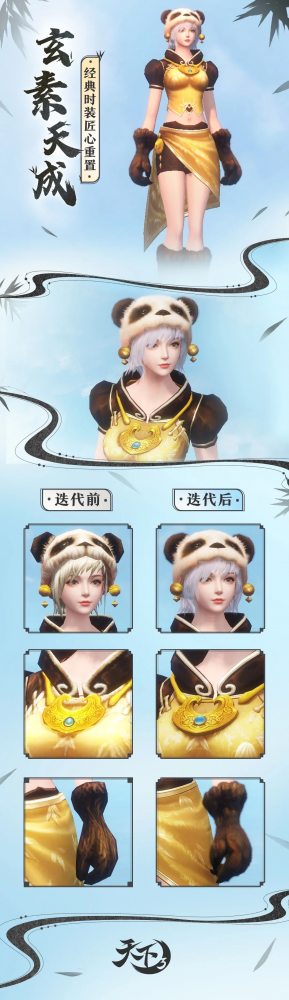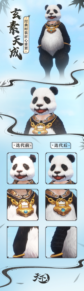 恰逢《天下》IP十五周年,为了回馈少侠们一路以来的支持与热爱,又一经典时装得到匠心重置,它就是与【黛染青花】齐名的【玄素天成】。本次重置使用当下最新的制作工艺,力求最大程度还原其野性与自然之美,快来感受一下它的魅力吧~ 大荒经典“熊猫装”,少侠心中“白月光” 玄素法宝,是大荒的珍宝之一。法宝盒子内的【玄素天成】时装与【熊猫侠客】元魂珠,是当年许多少侠梦寐以求的宝物,穿着玄素时装行走大荒,瞬间就能收获无数艳羡的目光~ 因其独特呆萌的熊猫造型设计,【玄素天成】被大家亲切地称为“熊猫装”。它是一代人心目中代表大荒山海国韵的经典,更是无数人心中执着的“白月光”,甚至出现“一衣难求”的场面。 下面就一起来看看,重置后的【玄素天成】吧! 【玄素天成】男装 男装的【玄素天成】,以大面积的绒毛材质为主。使用全新的毛发系统后,质感得到了显著提升,细软蓬松的绒毛,具有线条根根分明的利落感,让时装显得更加野生、自然。 身上的金饰经过重新打磨后,更加精致立体。纹饰清晰可见,弧线圆润自然,连光泽都更接近真实效果。一个灵动自然的熊猫跃然而出,穿上它便能化身为大荒最萌少侠~ 【玄素天成】女装 女装虽然没有男装的野性,但却更加俏皮可爱。短发变得丝丝飘逸,更为灵动。全新的毛发系统,同样为女装带来了更细腻的效果。毛茸茸的熊猫帽子搭配水汪汪的眼睛,更能展现出熊猫憨态可掬的气质。 帽檐的鎏金铃铛和胸前的长命锁,精致度加倍提升,更为立体真实。衣服上的竹子暗纹清晰可见。熊爪手套和及膝毛靴也更蓬松柔软,一股活泼娇俏之感扑面而来~ 交易与流通 本次不仅对【玄素天成】进行了重置,带来更好的视觉体验,还为现如今想要拥有它的少侠,开放了交易流通的渠道。 已获得【玄素天成】时装的少侠,可以将现有的旧时装合成可交易的新时装盒子【玄素天成】。 合成有一定限制,且只能合成一次。账号活跃等级达到8级及以上的少侠,可以消耗羽灵珠,将时装升级合成为可交易的时装盒子。不同活跃等级的少侠,需要消耗的数量不同,等级越高,消耗的数量越少。 合成后的时装盒子仅可通过跨服寄售系统中的【珍宝阁】进行全服流通。需要注意的是,盒子打开后,获得的道具为禁交易,且无法再次合成为可交易盒子,请谨慎操作哦~ 此外,【玄素天成】时装将于本周更新后支持使用羽灵珠升级为永久时装。 以上就是【玄素天成】时装重置的相关资讯啦,本周更新后,【玄素天成】的重置效果将正式上线,届时少侠们不妨前往大荒,欣赏它焕然一新的模样哦! |
