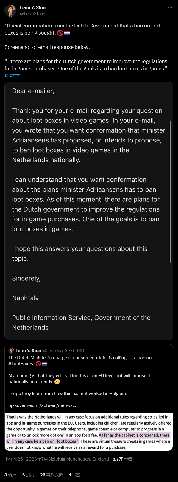 根据专门研究电子游戏内虚拟抽奖/战利品箱的研究者 Leon Y. Shaw 报道,荷兰公共信息服务部门在邮件中确认,该国官方正在准备完全禁止游戏内的战利品箱抽奖。