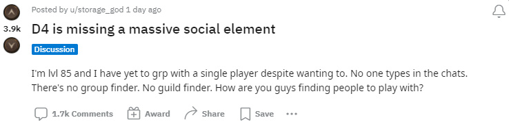 作为经典RPG游戏的标杆,现已推出第四代作品的《暗黑破坏神》历经操作设备、玩法习惯的变更,但都未曾影响到玩家感受游戏乐趣的方式。 即使不是参与“硬核难度冲级挑战”的《暗黑4》玩家,大家体验游戏的大部分时间也都在刷图。只求能尽快提升等级、爆更多装备。 然而当玩家不断追寻着某个目标,等级达到某个层次后,难免会开始思考这一切是否合理。近来外网针对《暗黑4》玩法向的讨论中,就出现了关于游戏社交属性的内容。一位玩家所提出的“《暗黑4》缺乏社交玩法”的问题,就引发了许多人的共鸣。 这位玩家表示,自己从0开始刷到了85级,但却从未跟人组队过。世界频道的玩家交流对话也寥寥无几,所有人都在忙自己的事情。虽然游戏中有公会功能,但却远不及暴雪的另一款游戏《魔兽世界》那般重要。 大部分《暗黑4》玩家似乎觉得,跟人交流会减缓自己的出货速度。 尽管有萌新玩家最初加入时,还会留意《暗黑4》的世界观、背景故事。可看着大家的等级越来越高,渐渐也变成了对话、剧情全跳过,查询攻略也只是为了了解哪个副本经验给得多。可这种单机游戏玩法,却有悖于现代玩家的部分玩法习惯。 当有人率先提出了对《暗黑4》社交玩法的需求后,大家一下打开了话匣子。吐槽自己开服一个月来的遭遇的同时,也开始了深入探讨。 目前呼声比较高的建议,主要体现在对游戏内语音系统的优化,以及副本匹配机制方面的需求。玩家们希望《暗黑4》可以推出自行选择难度、副本类型的匹配选项,匹配期间玩家能自由活动,大家希望通过这种方式来提升游戏体验。 这些社交要素在其他游戏中其实比较常见,但《暗黑破坏神》系列的主创们却对此表现得比较克制。不过《暗黑4》玩家想要的这种社交体验,其实能在《暗黑破坏神:不朽》中窥得一二。作为一款手游,《暗黑破坏神:不朽》玩家间的互动其实相对来说很是频繁。 以前的老玩家们习惯当“独狼”,但《暗黑破坏神:不朽》的联机社交玩法却占有不小的比重。社交玩法和PVP要素,都在主创们的未来计划当中。像是幽灵马车这样的事件,还允许多支小队在同一场景进行战斗。这些都是游戏主创,对《暗黑破坏神》社交玩法的探索。 当然,《暗黑4》的现有玩法也有属于自己的特色。同时也并不是所有玩家,都想在RPG之前加上MMO的前缀。如何在社交玩法方面找到平衡点,对主创们而言是亟待解决的问题,他们需要考虑所有人的感受。 那么大家又是否希望看到《暗黑4》出现更多社交玩法呢? |