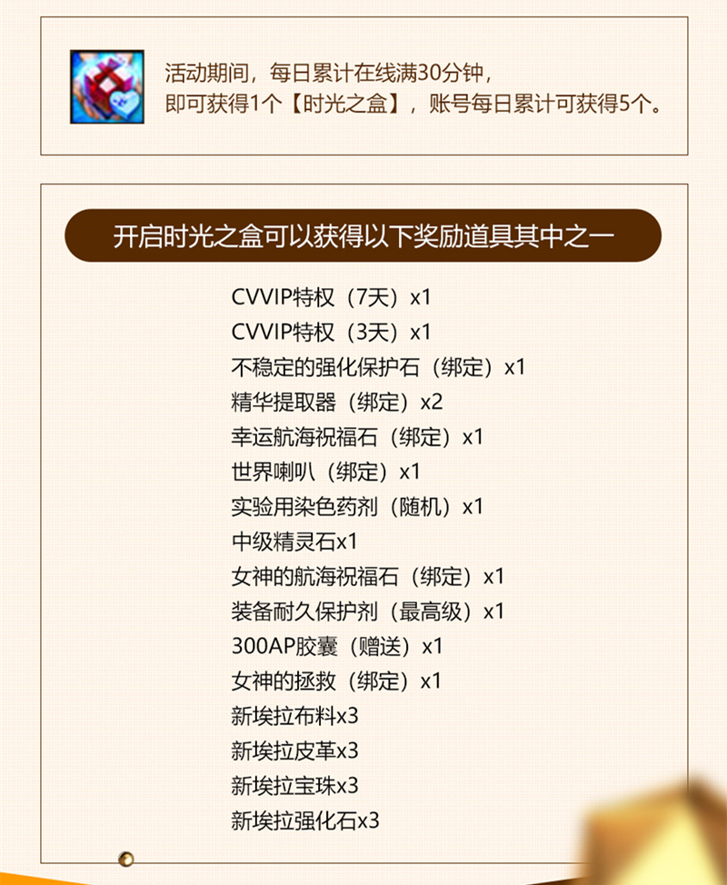 随着气温日渐炎热,《洛奇英雄传》游戏内也将上线新一轮福利活动!仅需在线即可获得“时光之盒”,其中可是包含了英雄们日常游玩时非常需要的实用道具!而英勇奋战的英雄在Raid战役中获得“炼金术师丢失的金币”后,还能按照自己的需求,兑换藏有神秘礼物的药水哟!那具体如何参与,都有哪些福利道具?现在一起揭晓吧! 【时光之盒】 在7月4日维护后至7月18日维护前,每日累计在线满30分钟,即可获得1个“时光之盒”,账号每日累计可获得5个!英雄们开启盒子可以获得下方奖励道具之中的其中一种! 【炼金术士丢失的金币】 在7月4日维护后至7月18日维护前,完成105级以上主线Raid战役(包含单人模式)后可从邮箱中获得“炼金术士丢失的金币”(每周最多可获得30个)!英雄们消耗金币可在兑换商店兑换到VVIP药水、保护石药水、碎片药水等装有实用道具的奖励哦! 以上,就是《洛奇英雄传》于7月4日上线的两个福利活动啦!在线即获实用大礼,激战之后英雄们还可兑换到实用道具!让我们一起在艾琳火热战斗,共度炎炎夏日吧! 《洛奇英雄传》运营团队 7月4日 |