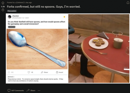距离《星空》正式发售依然由两个月时间,但是许多玩家已经迫不及待了。关于游戏的讨论从未停歇,不过其中一些粉丝在深入研究游戏过程中发现了一件有趣的事情。 一位已经被删除的用户在 Reddit 论坛上发布了一篇帖子,名为“已经确认由叉子,但仍然没找到勺子。兄弟们,我很担心”获得了许多玩家的关注,并获得了 1200 多此点赞。 在帖子中,这位粉丝截取了一个来自两年前的帖子,那个帖子的发帖人味道:“你们认为《星空》中会有勺子吗?勺子会如何影响游戏玩法和整体沉浸感?”虽然一开始看起来只是楼主的调侃,但随后许多玩家确实开始担心游戏里没有勺子,特别是考虑到随贴附上的另一张截图: 在屏幕截图中,一位顾客坐在餐厅里,看起来在享用一碗汤,以及一些太空小吃。但是明明在喝汤,却没有给他勺子。这导致许多玩家表示:托德,勺子呢?沉浸感全无,取消预购,这游戏没法玩了。 那么,是不是太空里就是没有勺子呢?B社此前在介绍游戏的时候宣称设计风格是“NASA朋克”,也许 NASA 的宇航员并不使用勺子?根据 PC Gamer 编辑 Harvey Randall 调查,在 NASA 网站上,官方表示:“宇航员使用刀、叉,和勺子。唯一不寻常的餐具是一把用来剪开包装的剪刀。” 这主要是因为 NASA 为太空食材设计了一个叫“勺碗”的包装。在包装中式脱水的食物,而包装的一边有一个“阀门”,允许航天员们使用勺子吃饭。也就是说,太空中是有勺子的! 当然,这些玩家应该并不会因为没有勺子就把游戏退款了。毕竟,没有勺子能吃的东西还有很多,例如官方介绍中一位开发者表示自己喜欢收集的三明治。 而至于那位顾客喝汤却没有勺子,另一位玩家 Flyraidder 说道:“伙计们,如果你不能用叉子替代勺子,那是你的技术问题。” |