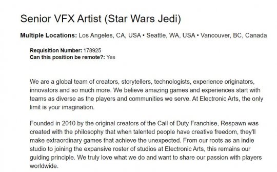 在发售不到3个月后,重生娱乐似乎已在开发新的《星球大战绝地》游戏。近日外媒发现重生正在为“星球大战绝地”团队招募多个职位,包括一个高级特效师(见下图)。 此前,导演Stig Asmussen曾表示一直希望将《星球大战绝地》打造成三部曲。随着最新游戏《星球大战绝地:幸存者》的成功,这暗示EA已经批准了第三款游戏。 这份招聘信息还确认重生计划在下一款《星球大战绝地》游戏中使用虚幻5引擎 虚幻5已经成为新游戏的行业标准。像CD Projekt Red这样的工作室已经转向了这一引擎,并且更多开发商也将追随这一趋势。EA Motive也将在工作室的下一个项目——《钢铁侠》中使用虚幻5。 随着Lumen和Naninte等新内容的加入,虚幻5在未来的游戏中具有很大的潜力。这使得它成为整个游戏行业中3A工作室的理想选择。 除了其他工作,重生还为游戏招聘一名高级战斗设计师,强调近身战斗。 |