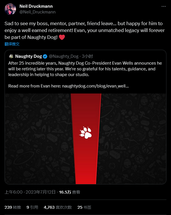 顽皮狗联合总裁年底退休:尼尔将全权掌控工作室