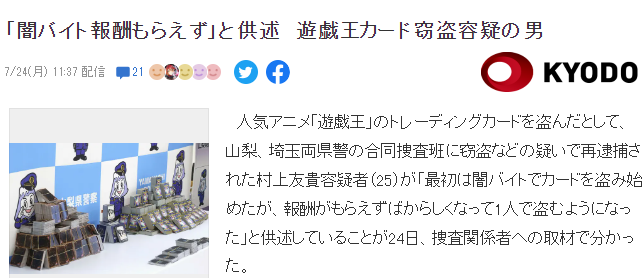 日本男子盗窃游戏王卡牌被捕 受网络黑暗打工委托却没收到报酬
