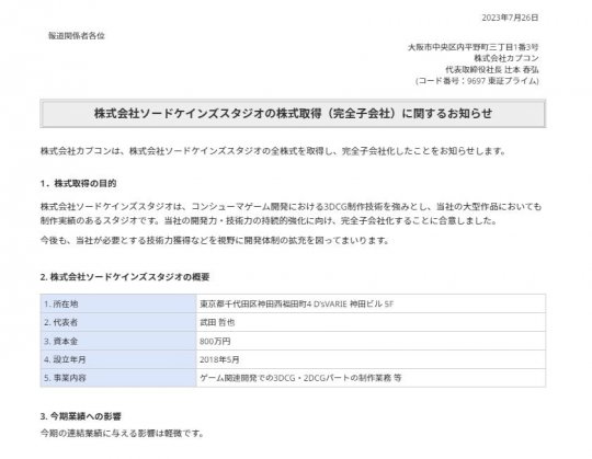 今日(7月26日),CAPCOM官方发布公告宣布收购Swordcanes Studio工作室,CAPCOM为了持续增强公司的开发技术能力,决定全资收购Swordcanes Studio工作室。