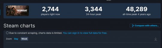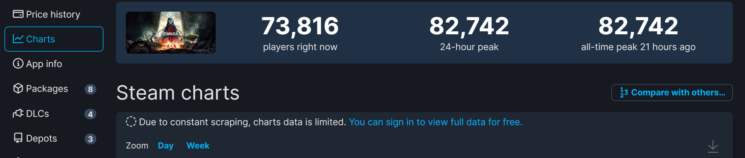 《遗迹2》已在昨天正式推出。在发售前,该作被PC玩家批评,因为开发商称PC版游戏是围绕分辨率拉伸(upscaling)技术(DLSS、FSR等)而设计。然而SteamDB数据显示,《遗迹2》并没有受到影响,其Steam在线峰值超过了8万(82742)。 对比来说,4年前的前作《遗迹:灰烬重生》Steam在线接近5万人: 此前开发商Gunfire Games表示即使游玩超过400个小时,也不会有人看到《遗迹2》的全部,这意味着《遗迹2》将为粉丝提供大量内容。Gunfire此前表示喜欢秘密和探索的粉丝会非常喜欢这款游戏。 除了在线峰值来到8万多人外,《遗迹2》还是Steam上当前最畅销的游戏,击败了《博德之门3》和《瑞奇与叮当:分离》。 |