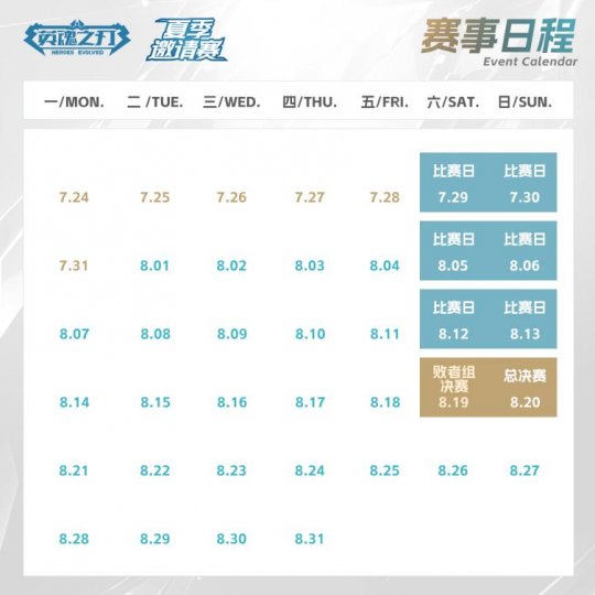 强者如林,锋芒毕露;精英对决,谁与争锋!2023夏季邀请赛将于7月29日19:00正式开战! 8支战队集结完毕 向冠军发起冲击 2023夏季邀请赛将于7月29日19:00盛大开幕。来自HEL精英联赛和精英挑战赛的顶尖战队将在这个夏天上演巅峰对决。8支战队现已集结完毕!他们将展开紧张刺激的比拼,一同争夺2023夏季邀请赛冠军。 2023夏季邀请赛参赛战队 YX、TOP、MR、982 SCT、HGS、CLS、LMK 锁定每个比赛日19:00 精彩赛事等你来看 7月29日-7月30日:胜败者分组赛 8月5日-8月6日:胜者组、败者组第一轮 8月12日-8月13日:败者组第二轮、败者组第三轮、胜者组决赛 8月19日-8月20日:败者组决赛、总决赛 详细赛程请持续关注官方微信公众号推送 沿用双败淘汰制 精彩赛程加码 8支战队采用双败淘汰制,除胜者组决赛、败者组决赛和总决赛采用BO5外,其他赛程均采用BO3进行。 (2023夏季邀请赛默认禁用英雄名单:安兹乌尔恭、战斗女神、少年曹焱兵、曹焱兵、夏玲、北落师门、地狱领主、嬴政、混沌之源、莫莫、潘多拉·亚克特、瑞鼠小仙。 对比2022精英挑战赛,以下英雄已被移除出默认禁用名单:苍穹天帝、夏侯惇、曹操、火神战姬、暗黑冥神、超核神兵、超械少女。) 如何观赛?请一定收好这份观赛平台名单 虎牙 房间号:【20379363】 直播间名称:英魂之刃官方赛事 视频号 直播间名称:英魂之刃 B站 房间号:【8664067】 直播间名称:英魂之刃官方账号 抖音 抖音号:【yhzrol】 直播间名称:英魂之刃 快手 快手号:【2291901012】 直播间名称:英魂之刃 斗鱼 房间号:【4576397】 直播间名称:英魂之刃赛事 关于2023夏季邀请赛 精英对决,谁与争锋!2023夏季邀请赛盛大开幕。来自HEL精英联赛和精英挑战赛的顶尖战队将在这个夏天上演巅峰对决。8支战队将展开紧张刺激的比拼,一同争夺2023夏季邀请赛冠军。 |