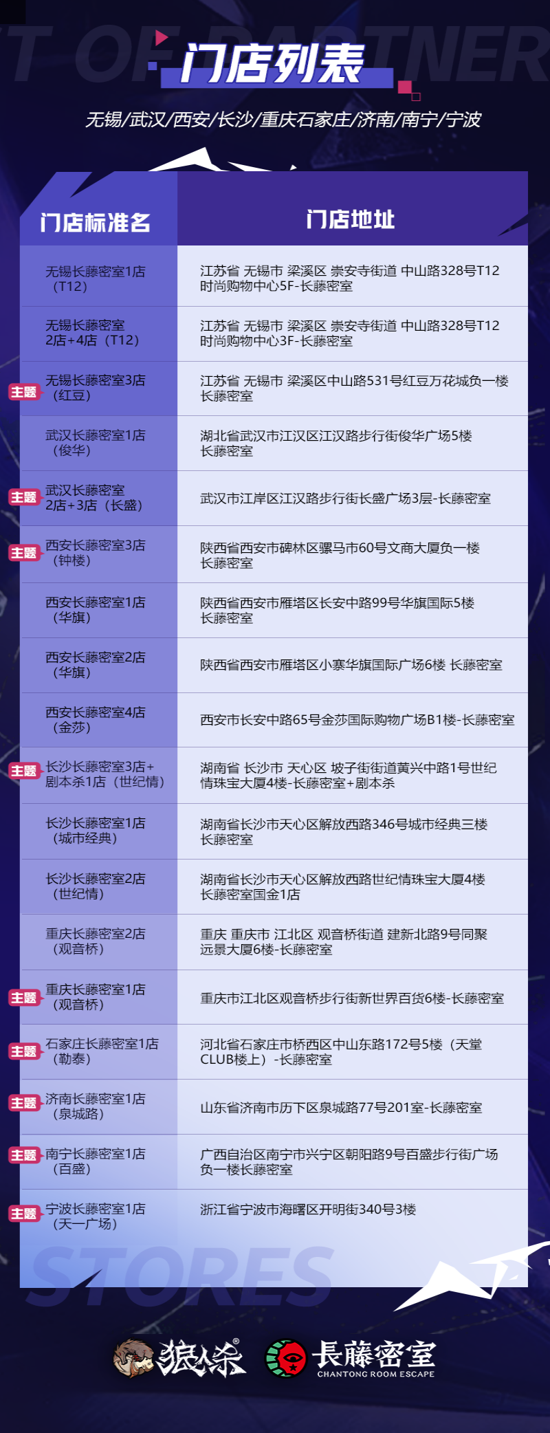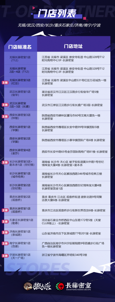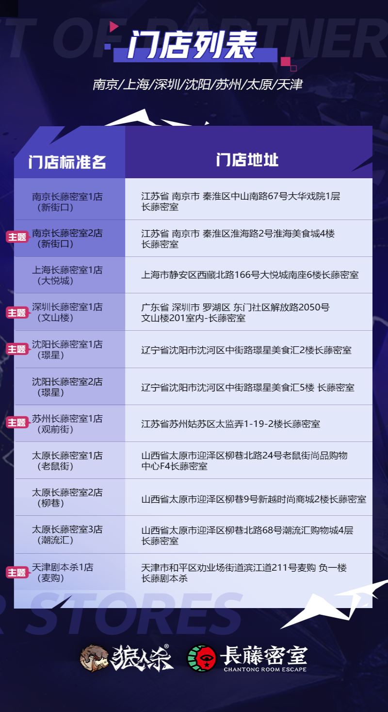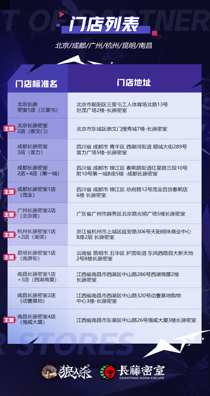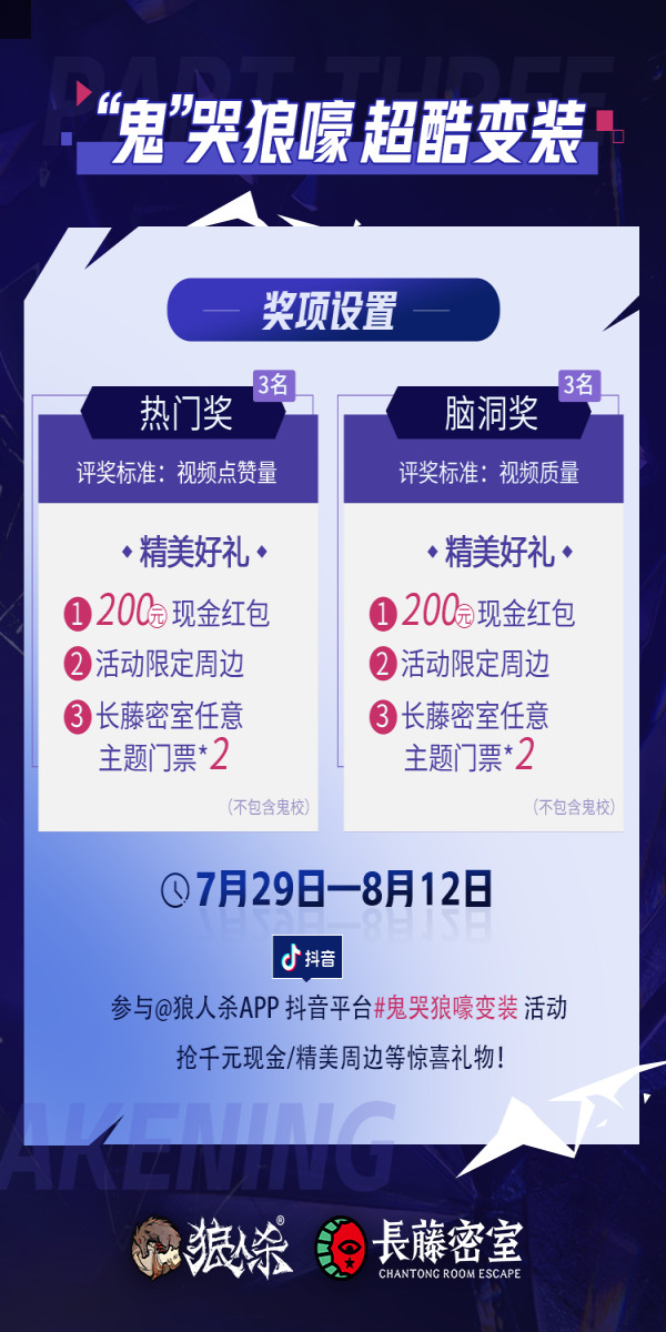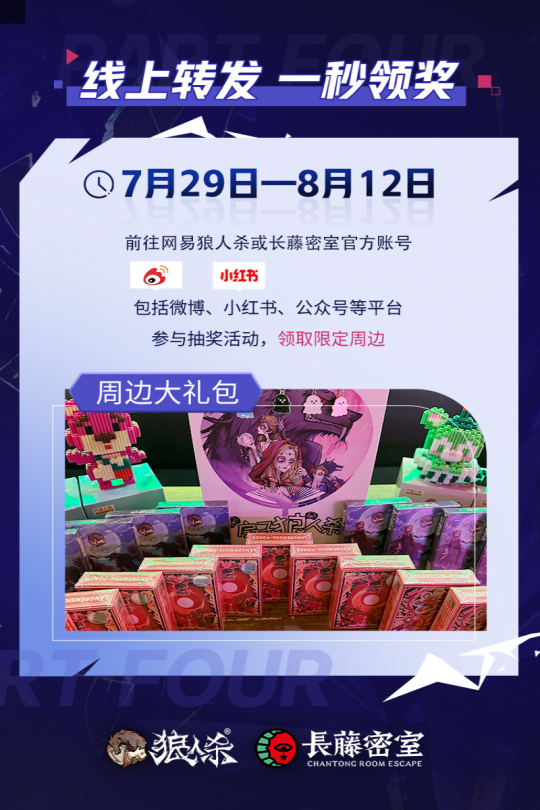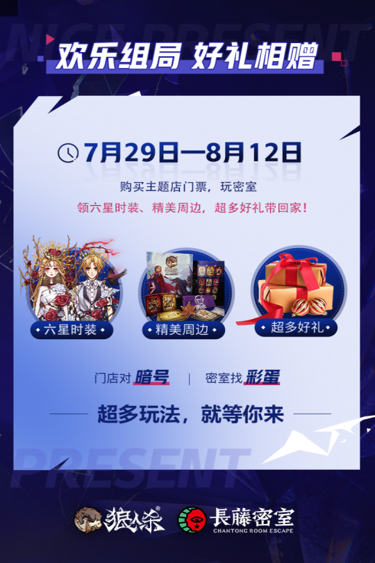 狼王觉醒,星动长藤!网易狼人杀x长藤密室联动活动正式来袭,7月29日起,全国40家线下门店集结,带你开启心跳追逃!还有21家【觉醒狼王】主题门店邀你热闹组局! 【主题门店,打卡赢惊喜】 7月29日—8月12日期间,网易狼人杀携手长藤密室打造【觉醒狼王】主题门店,包括北京、成都、广州、上海、西安等多座城市在内的全国40家门店同步开启联动,还有21家主题门店等你来体验! 活动期间到店参与现场活动,拍照打卡并带话题“狼王觉醒星动长藤”分享至社交平台,即可赢取惊喜礼物! 【寻宝游戏,集卡兑礼物】 活动期间,前往长藤密室线下任意主题门店体验,即有机会获得寻宝卡牌,集齐一定数量的卡牌即可兑换狼人杀周边,更有限量六星时装等你来解锁! *具体活动参与方式请咨询门店 【抖音挑战,开启潮酷变装】 “鬼哭狼嚎变装”抖音话题挑战活动同步开启!活动期间前往抖音平台,带指定话题及音乐拍摄【觉醒狼王】主题变装视频,即有机会得现金红包、活动限定周边或长藤密室主题门票! 【转发关注,多平台好礼相送】 全平台抽奖活动同步开启!活动期间前往狼人杀官方平台或长藤密室官方账号即可参与抽奖活动,更多限定周边等你来拿! 网易狼人杀x长藤密室联动活动正式上线,快来密室开启你的探险之旅,赢取更多惊喜礼物吧! |