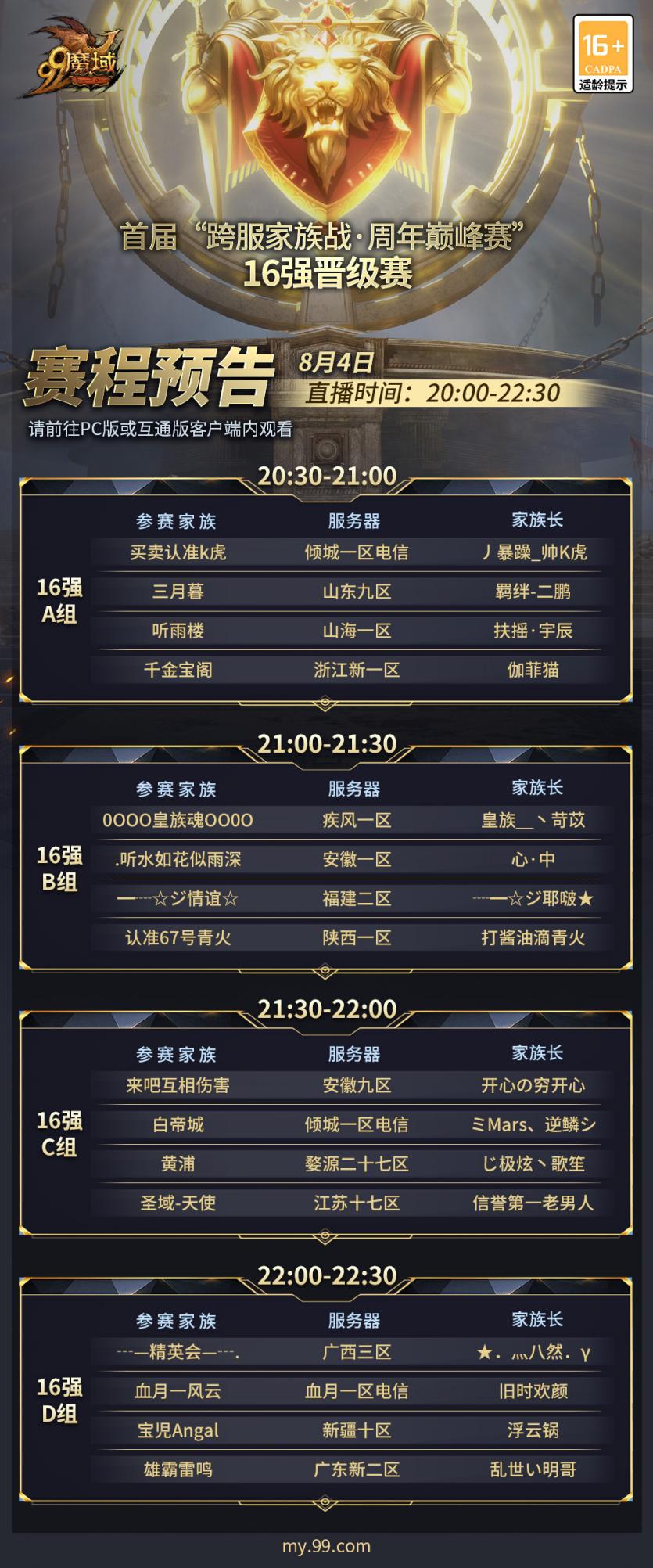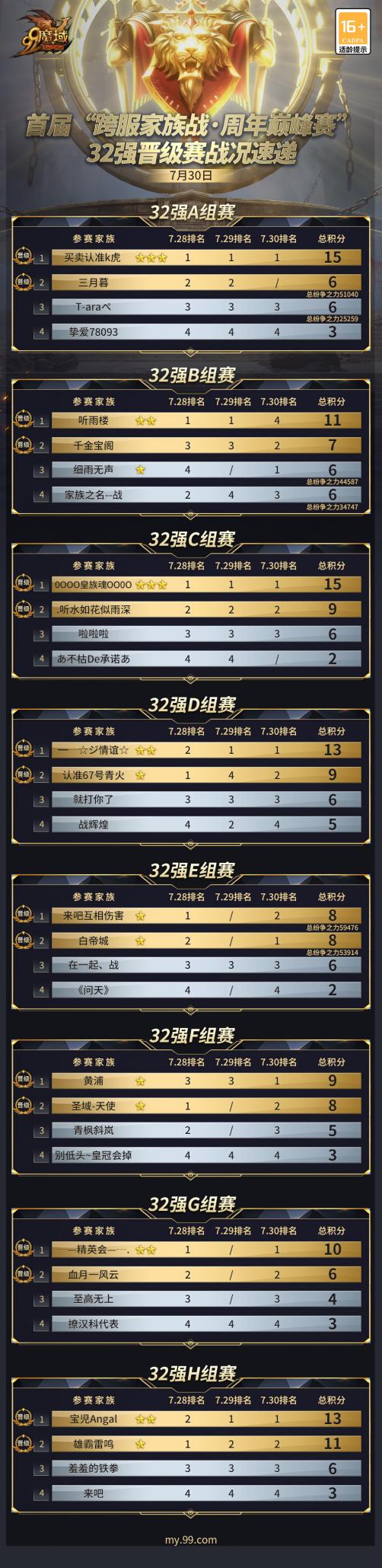 凝聚家族意志,剑指极致荣耀!《魔域》首届“跨服家族战·周年巅峰赛”32进16赛程已于近日完结,历经连续3日的鏖战,16支家族队伍突围成功,斩获巅峰荣耀殿堂的入场资格!一同细数晋级名单,纵观家族高光时刻! 残酷赛制热血鏖战 16强家族诸神归位 三轮次热血拼杀,出线权几度易主。而今封神榜上16强诸神均已归位,让我们为其助威呐喊! 32强A组:开赛以来【买卖认准k虎】与【三月暮】两大家族就已牢牢占据本组1、2名宝座,而携手出线的结果也是对其硬实力的最佳肯定。 32强B组:小组头名【听雨楼】实力毋庸置疑,而同样颇具实力的【细雨无声】却因为第二轮的违规丢分让本组出线名额变得扑朔迷离;最终【千金宝阁】把握住了机会,最后一轮摘取第二,将出线名额收入囊中。 32强C组:三轮比赛【0OOO皇族魂OO0O】均是一骑绝尘,【.听水如花似雨深】紧随其后,最终也正是此二家族锁定了出线名额。 32强D组:前两轮比赛【━┈☆ジ情谊☆】与【认准67号青火】轮流占据头把交椅,第三轮终于分出高下,分别以小组一、二名身份顺利晋级。 32强E组:最后一轮开赛之前E组出线形式仍可谓扑朔迷离,【来吧互相伤害】、【白帝城】、【在一起、战】三支队伍分差不过2分;最后一役白帝城全力以赴摘下本轮第一,来吧互相伤害位列本轮第二,两大家族均积8分携手晋级。 32强F组:F组战况犹如E组的翻版,前两轮比赛【黄埔】始终排名第三,最后一轮却迎来逆袭登顶,头名出线;【圣域-天使】凭借稳定发挥占据第二;而曾有望出线的【青枫斜岚】只得饮恨退场。 32强G组:本组比分依旧胶着,但好在【┄—精英会—┄.】与【血月一风云】凭借稳定实力在最后关头守住了一、二名的出线机会。 32强H组:首轮对决虽是【雄霸雷鸣】拔得头筹,而随后两轮【宝児Angal】则奋起直追摘下桂冠,以积分榜首之位与【雄霸雷鸣】携手出线。 巅峰荣耀犒赏惊人 直播观战好礼纷呈 16强新鲜出炉,“跨服家族战·周年巅峰赛”下半程开赛在即!8月4日至8月6月,等待着参战家族的将是更为残酷的单场淘汰赛制——唯有经受住连续三日疾风骤雨般的洗礼,方有资格问鼎巅峰家族的最高荣耀!夺冠家族更可揽下88888元京东卡奖励! 与此同时在游戏客户端内观看赛事直播、参与加油助威的玩家也有海量好礼恭候:每日观赛最高可得1000点“巅峰赛幸运豆”,兑换幸运礼盒开启500元京东卡、纪念银币等超值大礼;直播间内还将持续发放福袋大奖,抽取2000元京东卡华为mate30 Pro、10000点魔石等豪华奖励,让这场家族盛事成为属于每位玩家的热血狂欢! 巅峰家族花落谁家,观赛竞猜好礼备至!《魔域》“跨服家族战·周年巅峰赛”即将进入白热化阶段,共同见证载入《魔域》史册的家族对决,畅享豪礼天降的惊喜时刻! |