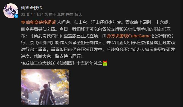 8月1日,仙剑奇侠传官方微博宣布《仙剑奇侠传四》重制版已正式立项,该作将由方块游戏投资制作发行,由原《仙剑奇侠传四》制作人张孝全担任制作人,采用虚幻引擎在原作的基础上对游戏进行完全重制。目前《仙剑奇侠传四》重制版仍在正常开发中,开发进度将在之后不定期公布。