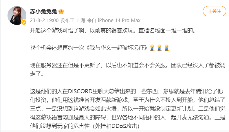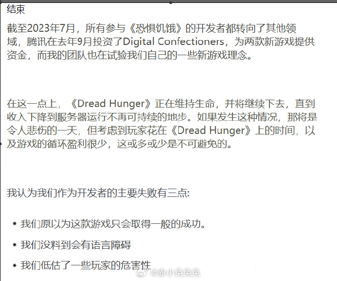 在去年,一款名为《恐惧饥饿》的狼人杀游戏火遍了主播圈子,包括PDD、JY、囚徒、腿毛在内的各大人气主播都迷上了在开船过程中抓内鬼的快乐。事后,也是这款游戏的节目效果太好了,吸引到腾讯出手投资。但人没想到的是,开发商Digital Confectioners并没有选择继续优化《恐惧饥饿》,而是直接解散了相关团队,跑去开发两款新游戏了。 根据知名主播赤小兔的爆料,《恐惧饥饿》服务器还在,但游戏已经不更新了,且玩家人数在持续下降中,如果未来人气进一步下滑的话,不排除开发商会选择关服。至于游戏停更的原因,主要在于他们从项目立项时,就没有考虑过为《恐惧饥饿》后续增加DLC的计划,且语音不通也是阻碍这款游戏持续发展的一大弊端。除此之外还有一个原因,他们遭遇了外挂与很可怕的DDos攻击,被黑客给整怕了。 从赤小兔分享的消息来看,我们还能发现截至2023年7月,《恐惧饥饿》的研发人员已经全部转去开发Digital Confectioners的其他两款新游,且整个团队都准备用投放的资金去尝试一些新的游戏理念,而不是在狼人杀的玩法中原地踏步。 对此,网友也是表示:“网络公主、喷子、外挂的泛滥,官方又不维护游戏环境,只能凉了呗”,“狼人杀类游戏基本就是主播专属,普通人路人游玩体验极差,和朋友开黑能凑到8个用Steam的可太难了”,“确实是很好玩的游戏 官方维护不给力”。 总的来讲,目前市面上类似“狼人杀”玩法的游戏实在是太多了,但能在众多竞品中脱颖而出也证明这款游戏的魅力所在,没能持续更新着实是可惜。当然对于小工作室来讲,他们所需要考虑的因素很多,一方面是游戏后期的规划,另一方面是对投资方负责,所以开发新游也是能理解。 |