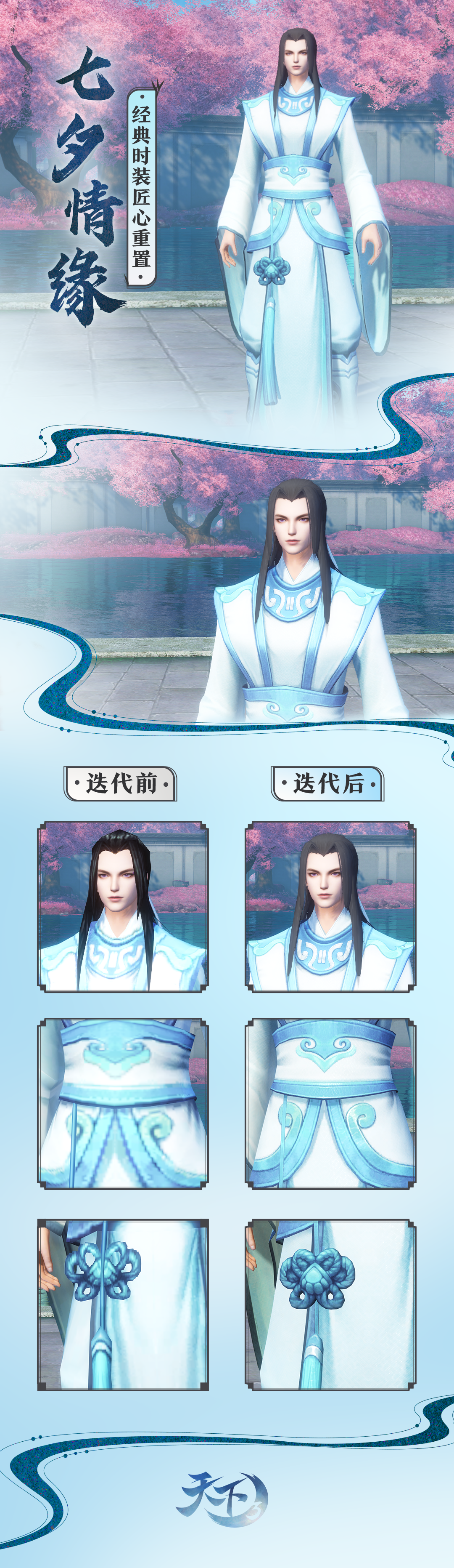 七夕天河白露明,八月涛水秋风惊。时间一转眼便来到了八月,大家是否都想到了一个美好的节日,农历七月初七的七夕呢?大荒内的佳偶们又可穿上情侣装秀恩爱啦~恰逢七夕佳节前后,经典国韵情侣装【七夕情缘】重置后靓丽来袭,还有全新外观【十里红妆】、双人互动坐骑【蝶梦寻花】甜蜜登陆大荒,与少侠们共度良辰好时光!话不多说,下面一起来看下新装的讯息吧~ 七夕情缘配,佳偶自天成 每年的七夕佳节,都有无数佳偶在大荒各处秀起恩爱,大家除了为对方准备表达爱意的礼物之外,不少少侠还有一件必须要做的事,那就是一起换上【七夕情缘】!今年的七夕虽然未至,但焕然一新的【七夕情缘】早已为少侠们备好,一起看看吧~ 七夕今宵看碧霄,牵牛织女渡河桥。女款的【七夕情缘】以水袖与分叉裙摆的设计,展现女子的曼妙体态。衣装重置后布料质感明显提升,搭配天青湛蓝的主色调,更给人如流水般温柔的感觉。同时,腰间坠着的玉佩,内嵌蓝色宝石,更是将细节拉满,予人更丰富的视觉层次感!图案的缝绣也更加细腻,双肩与裙摆的纹饰十分精致,处处皆细节,只为更突出佳人风采。 言念君子,温其如玉。男装的重制同样独具匠心,凸显公子翩翩,温文尔雅。重置后的头发更柔和,更贴合少侠们心目中“男神发型”应有的质感。腰封与衣摆处的纹理更加清晰,衣物质感有了明显的提升,而腰间的坠饰,则修补了原有的缺漏,如今更为完整。星夜花灯前着此华服赴约,定当不负良人佳期~ 十里红妆结同心,蝶梦寻花渡红尘 除了经典时装【七夕情缘】的重制,《天下3》还为大家准备了全新外观【十里红妆】与坐骑【蝶梦寻花】,让少侠们的七夕更为缤纷丰富,下面继续欣赏一下吧~ 与君初见,便问君心。少女发辫长束,红绳永结,头纱翩然,情意缱绻,只愿一生白首不相离。俏皮可人的短裙如花瓣绽放,剪裁精细的白纱环于身前,将如雪肌肤隐于朦胧之中,更显粉妆玉砌,娇丽过人。同时,胸前、手腕与脚腕,各处皆有红艳的玫瑰,与蝴蝶结装饰,尽显喜结连理的美好寓意。惟愿天作之合,琴瑟和鸣。 少年身着锦绣婚服,他高束黑发,头戴玉冠,华服黑白相配,意气风发。以玄红轻纱为披,缀以金粉装饰,潇洒俊逸,风华无双。腰封的银饰上系有丹红绸缎,意喻有情人此生相连。衣装上纹绣的图案精致而大气,一笔一画皆是情意满满,烘托出少年气质出尘,可谓郎艳独绝,世无其二! 画舸春眠朝未足,梦为蝴蝶也寻花。双人互动坐骑【蝶梦寻花】带你与爱侣感受花间戏蝶的乐趣!莹亮的蝴蝶牵引着,由数颗珍珠缀连而成的银线,如梦似幻,营造浪漫氛围。淡紫与宝蓝渲染的鎏金座椅,戏蝶赏花之余,还能将身侧的佳人拥入怀中,如此甜蜜互动,实在是羡煞旁人! 在即将到来的七夕佳节,与心爱的ta一同换上全新外观坐骑,在大荒共度花前月下之良辰,真可谓只羡鸳鸯不羡仙呀!无论是经典重置的【七夕情缘】还是全新登场的【十里红妆】,都能为你的七夕约会增色不少,快登录游戏体验一番吧~ |