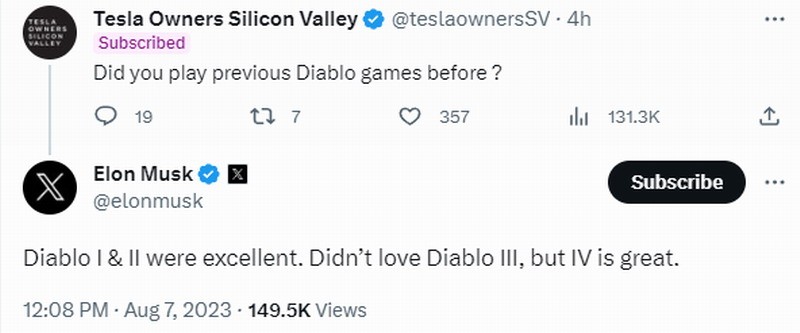 有网友询问马斯克 ,之前有没有玩过《暗黑》系列游戏。马斯克表示:“《暗黑1&2》都很出色,我不喜欢《暗黑3》,但是《暗黑4》不错。”