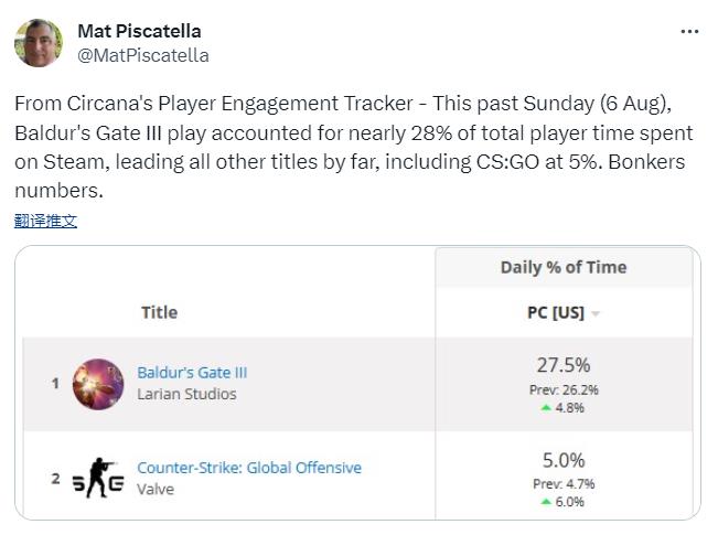 根据Circana执行董事Mat Piscatella的说法,上周日,《博德之门3》占据了美国Steam总游戏时长的27.5%,而在第二位的《CS:GO》,这一数字仅为5%。