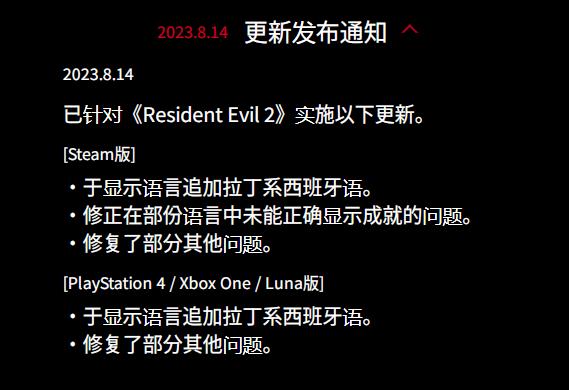 近日,卡普空在全平台上推送了《生化危机2:重制版》的新更新补丁,主要添加了一种新语言支持:拉丁美洲西班牙语,现在《生化危机2:重制版》支持语言数量已经达到了15种。除此之外,该补丁还修复了其他Bug,而Steam版还修复了部分语言未能正确显示成就的问题。